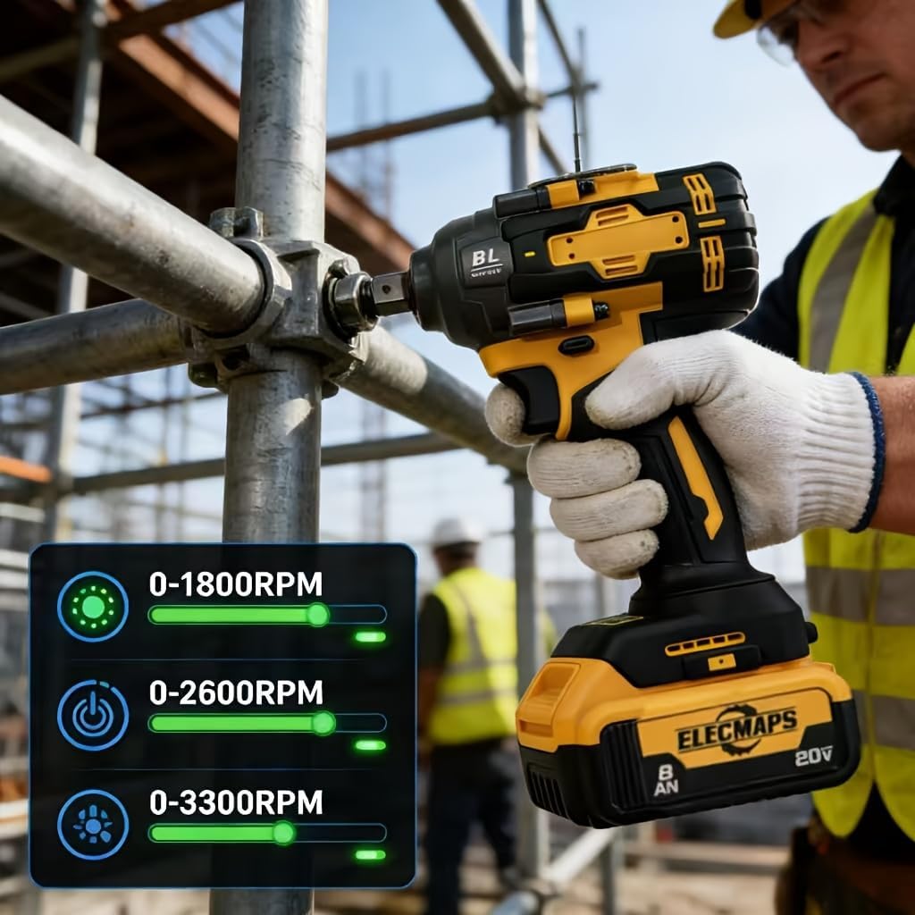 ELECMAPS Cordless Impact Wrench, 20V compatible, 1/2" brushless, 650N·m high torque, 6 bits + adapter included, for car & home, ideal gift for men