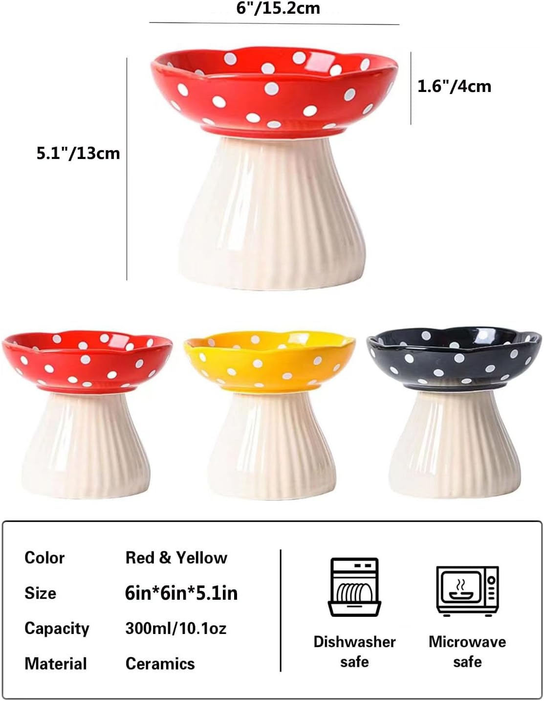XJYYLX Elevated Mushroom Cat Bowls Ceramic, Cute Raised Cat Bowls for Indoor Cats, Whisker Fatigue Cat Bowl Red+Black+Yellow 6" Wide