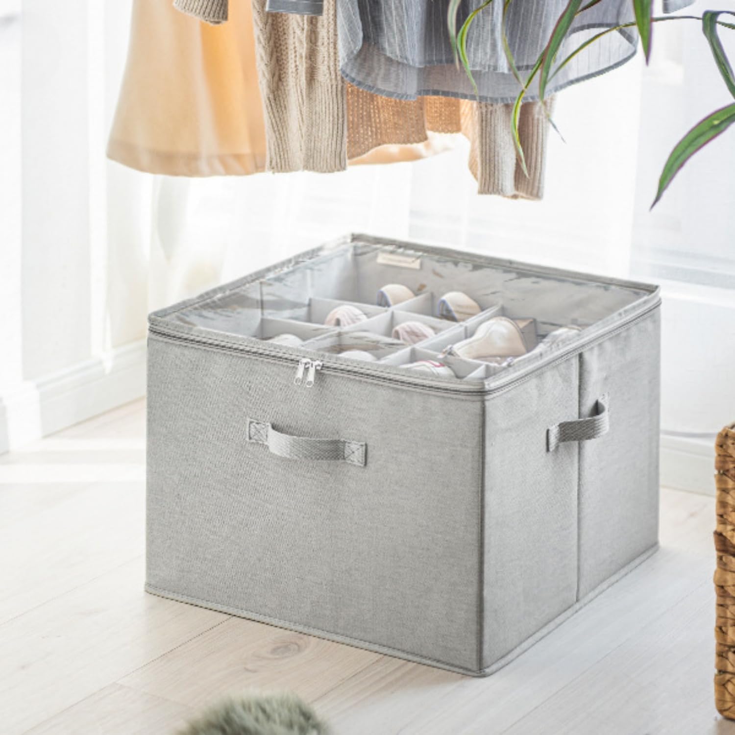 Embroidery Fabric Shoe Organizer Storage Box, Foldable Fabric Shoe Box with Handle, Shoe Organizer Box with Adjustable Dividers,Clear Cover, Fits up to 16 Pairs, For Boots Heels Sneakers Features: 1. Adjust & View: Keep Shoes Tidy and Dust-Free with Customizable Dividers + Clear Lid 2. Holds 16 Pairs, Stays Sturdy: Store 16 Pairs (17"X17"X12.5")—reinforced to Hold Shape When Full or Moved 3. Move Anywhere Easily: 3 Easy-Grip Handles Let You Push, Pull, Or Lift It Anywhere Specification: Name: Fabric Shoe Organizer Storage Box Material:Oxford Cloth Color:Black,White,Gray Target Audience: Unisex Package Included: 1 Pc * Fabric Shoe Organizer Storage Box Note: 1. Due to Differences in Lighting and Screen Settings, The Colour of the Item May Differ Slightly from the Pictures 2. Please Allow Slight Differences Due to Manual Measurement