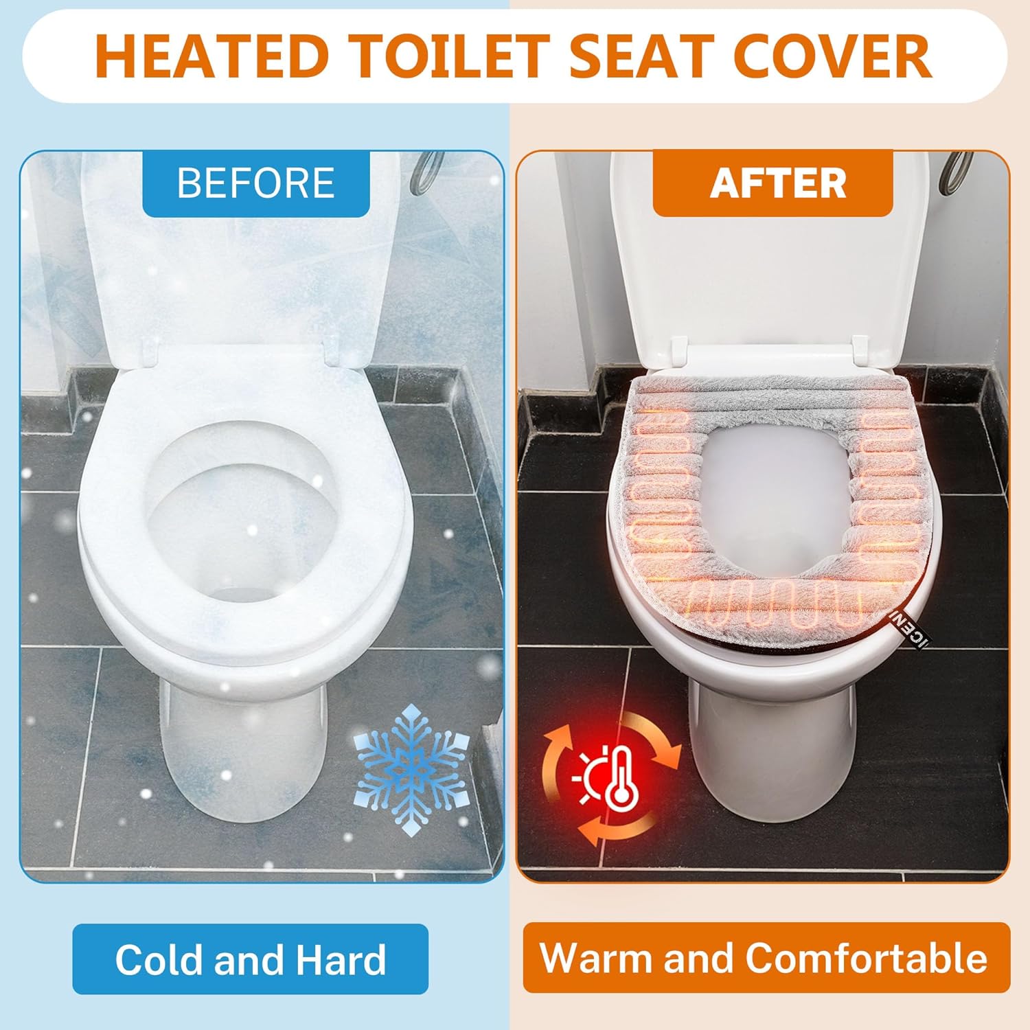 Package Includes: Heated seat covers *2Chargers *2USB cables (5.25 ft) *2Adhesive shelves *2Adhesive cable clips *20Specifications: Product Size: 16.9" x 14.5"Material: faux rabbit fur, PU materialRated Voltage: 5VRated Current: 2ARated Power: 10WHeating Levels: 95℉ / 104℉ / 113℉ / 122℉ / 131℉ (at 77℉ room temperature)Timer Settings: 4H / 8H / 16H / 24H / NO (NO = continuous operation)Features: 1. Customize your comfort with 5 heating levels and 5 timer settings, including continuous warm mode for full day warmth use or automatic energy-saving shutoff. 2. Powered via included USB adapter or any power bank (not included). 3. Keep your bathroom organized with the included adhesive power bank shelf and 10 cable clips for tidy cord management. 4. Install easily in seconds with a wrap-and-zip design, enjoy heating within one minute, and clean conveniently by machine washing.