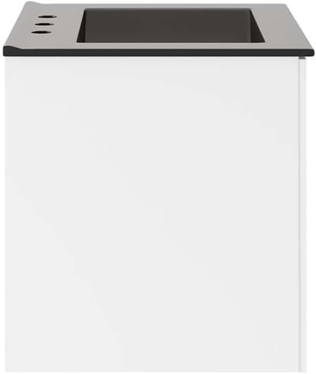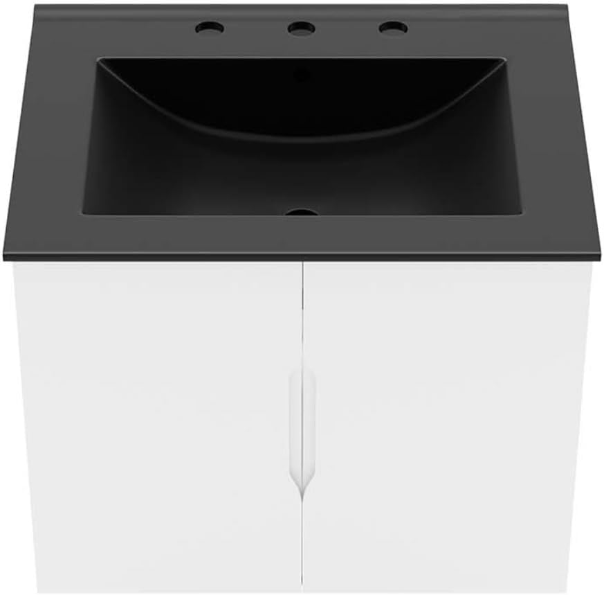 Introducing the Vitality 24" Bathroom Vanity, a perfect addition to energize your bathroom space with its modern design. Crafted with durability in mind, this vanity is made from high-quality particleboard and MDF with a sleek melamine finish. Featuring a wall-mount design, this vanity not only saves space but also adds a touch of elegance to your bathroom. The ample storage space behind two soft-close doors allows you to keep your bathroom essentials organized and your countertop clutter-free. The ceramic sink basin with 8-inch centerset faucet holes and integrated countertop adds a seamless and stylish look to the vanity. The open back design accommodates plumbing, making installation hassle-free. Please note that fixtures are not included, and assembly is required.With its modern aesthetic and functional design, this bathroom vanity is perfect for any contemporary bathroom. The soft-close doors ensure quiet and smooth operation, while the MDF and particleboard construction guarantees long-lasting durability.The product dimensions are 17.5"L x 23"W x 18.5"H, with overall cabinet dimensions of 17.5"L x 23"W x 18.5"H. The floor to underside of the vanity measures 14.5 - 15.5"H, and the inner width is 22"W. Upgrade your bathroom with the Vitality 24" Bathroom Vanity and enjoy the perfect combination of style and functionality.