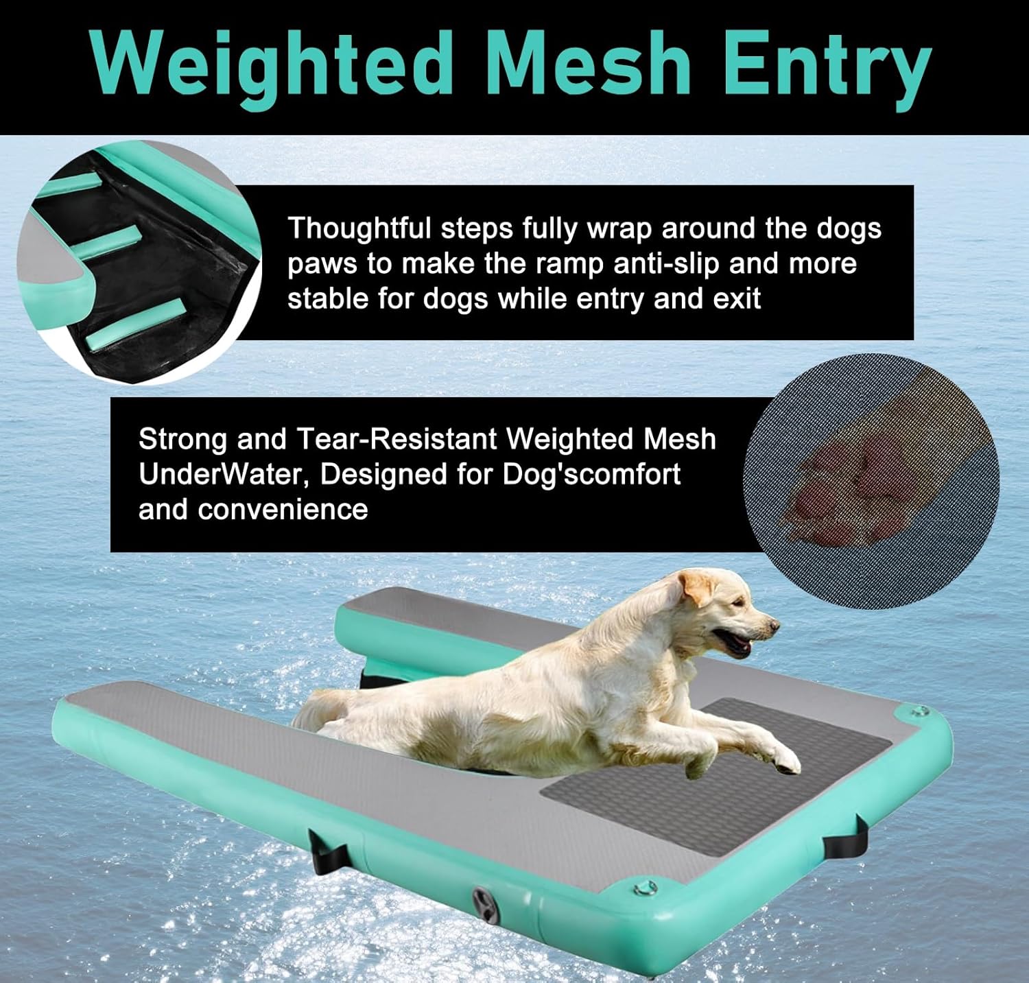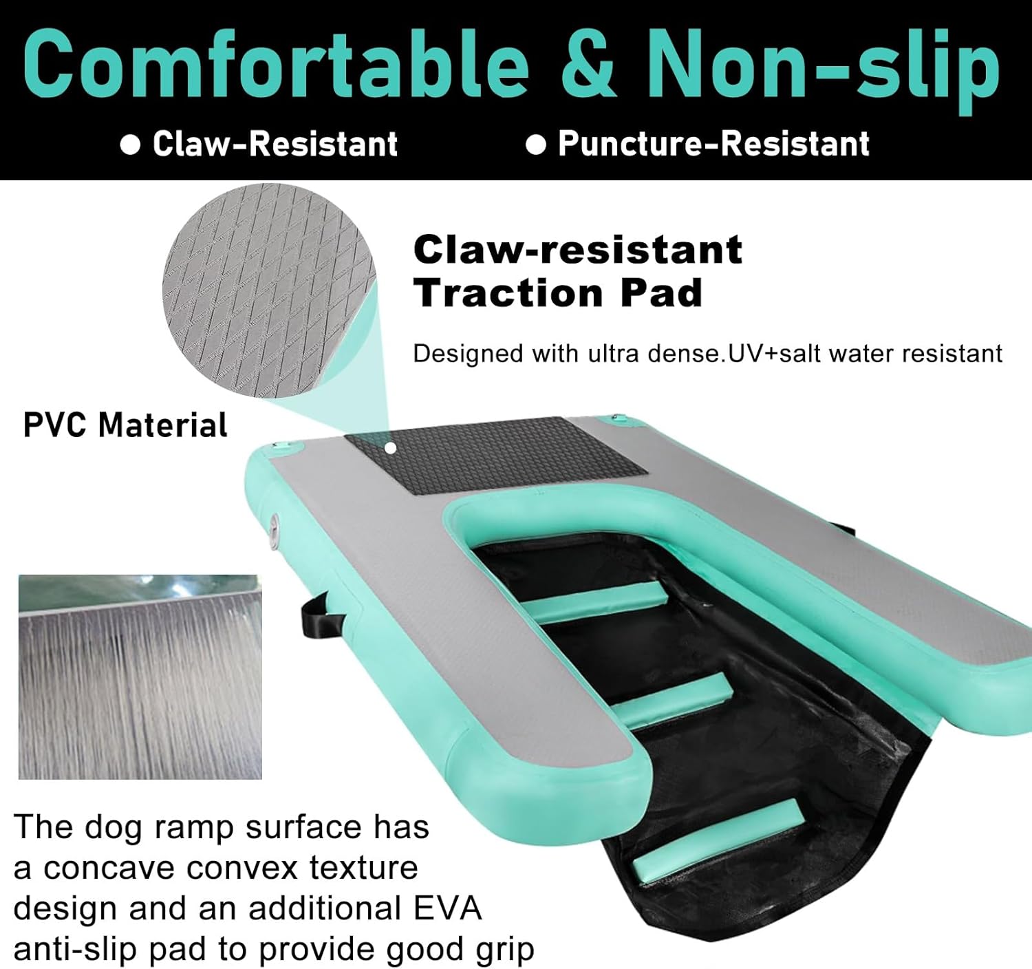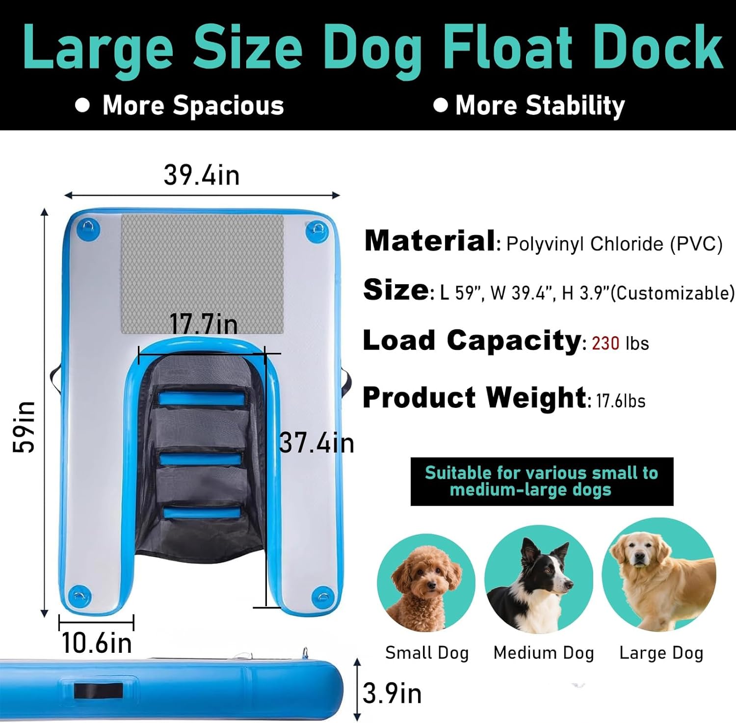 Engineered with the durable materials, this dog ladder is designed to endure and accommodate even the largest of dogsThis floating dog ramp allows your dog to get in and out of a boat, dock, or pool with ease.Versatile and adaptable to various water activities, it's perfect for poolside lounging, pontoon boat adventures, or dockside playExperience the joy of safe and easy water access for you and your dog, with the added convenience of having everything readily available whenever you need itMaterial: Polyvinyl Chloride (PVC)Color: Cyan , Blue , Black , Red , YellowSize: L 59 in, W 39.4 in, H 3.9 inProduct Weight: 17.6 lbsLoad Capacity: 230 lbsPackage Content: 1 x dog boat ramp1 x handy carry bag, 4 x ropes1 x hand pump1 x repair kitFeature:The dog pool platform is made of PVC, rigid when inflated, claw-resistant and punch-resistant, so that dogs can enter and exit with confidenceThe dog ramp is made of anti-leakage material to ensure stability and prevent rollingThe dog swim ramp surface has a concave convex texture design and an additional EVA anti-slip pad to provide good gripPool dog ramp mesh is firmly stitched and not easy to tearInflatable dog ladder built-in steps add increased traction underwaterFast Inflation Set up in minutesStorage-Friendly Easily packs awayComfortable platform for dogs of all sizesTips:Manual measurement products may have dimensions of a few centimeters of difference, please understandThere may be some differences between the image and the product due to display and lighting reasons, please refer to the actual product