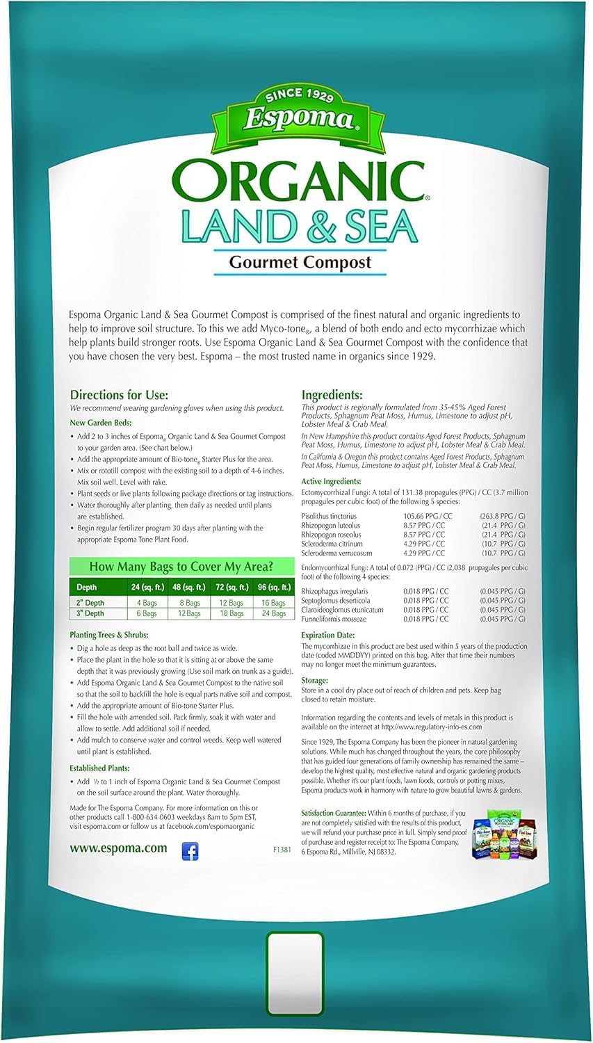 Espoma Organic Land & Sea Gourmet Compost is the ultimate compost mix to use for planting vegetables, flowers, trees and shrubs. It contains a rich blend of the finest natural ingredients and is enhanced with crab & lobster shells from the sea along with Myco-tone, our proprietary blend of mycorrhizae, to help build strong roots and better plants.