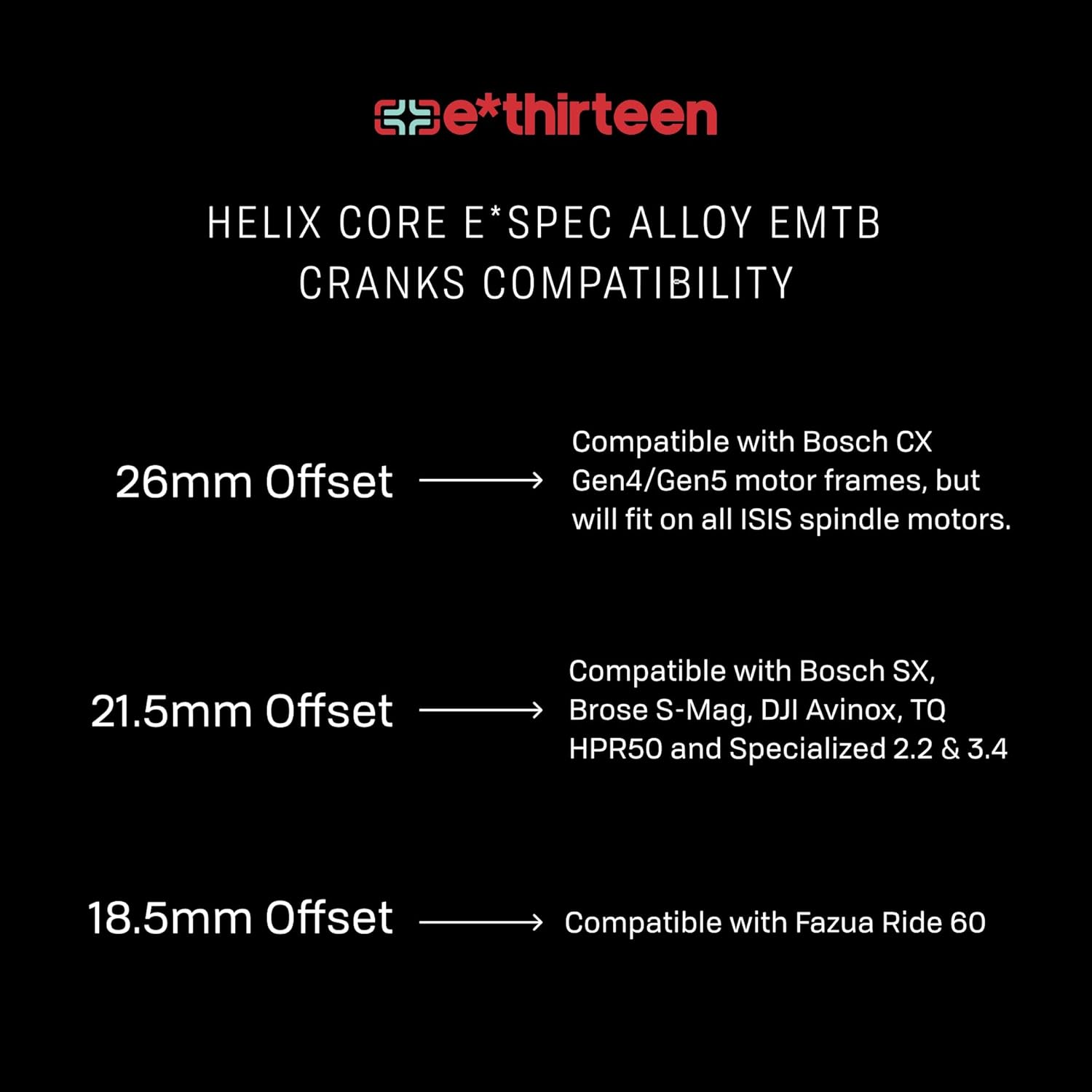 Helix Core e*spec cranks deliver an e-bike drivetrain upgrade with high-end integrity and aesthetics at an extreme value. Engineered for e-MTB strength, so you don’t need to worry about pedal strikes or holding back on your next gravity run. Forged 6066-T6 aluminum crank arms keep you confident while the alloy self-extractor system keeps routine service tasks efficient. Added details like steel pedal washers and molded impact boots give this crank all the high-end features a rider hopes for.