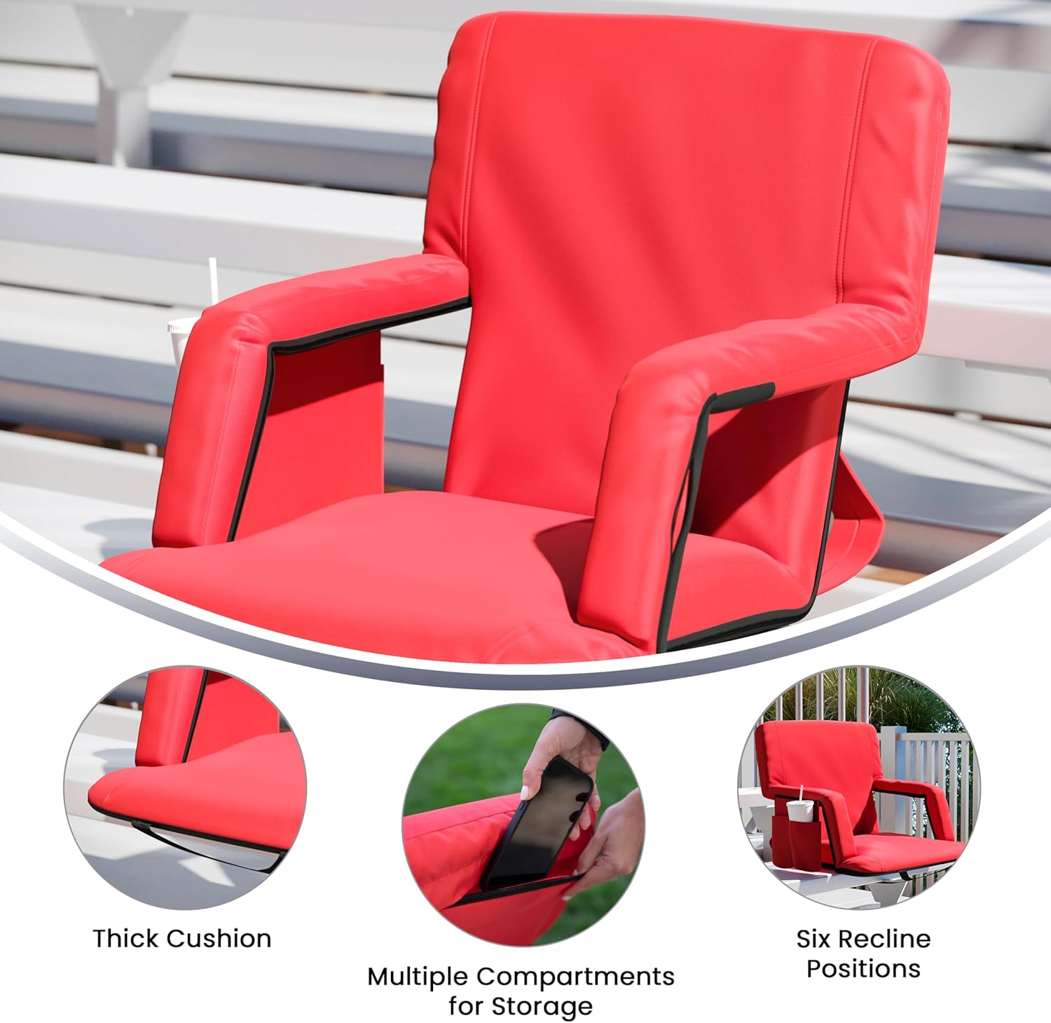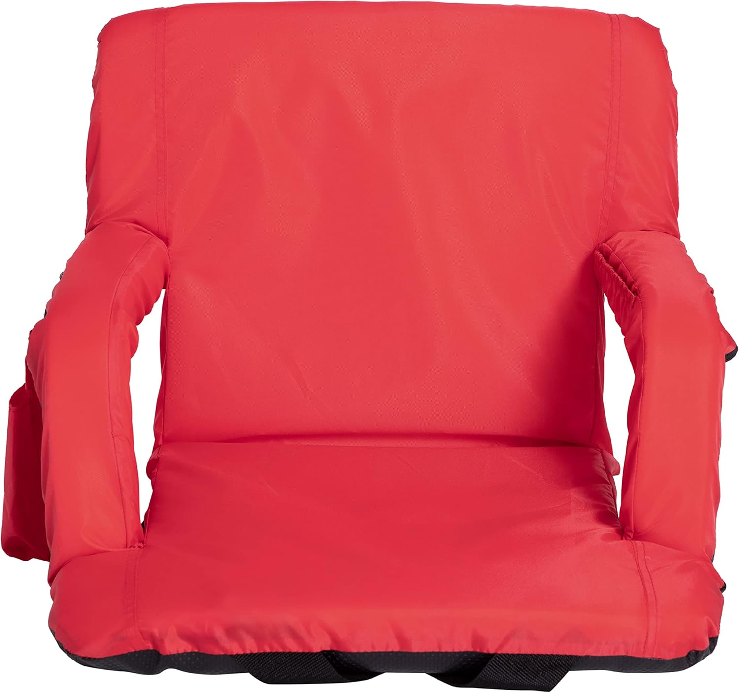 Whether you're off to the big game, your favorite campsite, or a day at the beach you will always have a comfortable place to sit with this portable reclining stadium chair. Boasting 6 reclining positions, dual storage pockets, a thick cushion, and the ability to be used with or without armrests, this must have indoor/outdoor chair meets your every seating need. When you're done for the day, simply lay the chair flat and use the adjustable backpack straps to free up your hands while you take the chair with you to the car, RV, or into the house. The slim profile makes vertical or horizontal storage a breeze. Premium, long-lasting materials ensure this multifunctional reclining chair is strong and reliable. The 24 gauge metal frame is strong, but lightweight for carrying and the heavy duty polyester fabric back and seat are coated for water resistance. The reinforced non-slip underside provides additional grip to prevent sliding for a worry free seating experience while bottom straps snap into place to securely attach yourself to the bleachers while you cheer for your favorite team. Use this versatile outdoor chair as alternative seating for outdoor learning during nice weather. Recommended for upper elementary through college age students, this handy, portable chair is ideal for the playground or the quad on campus. A slim profile makes vertical or horizontal storage a breeze and best of all, no assembly is required for your new outdoor recliner. Wipe clean to maintain the looks of this backpack chair.