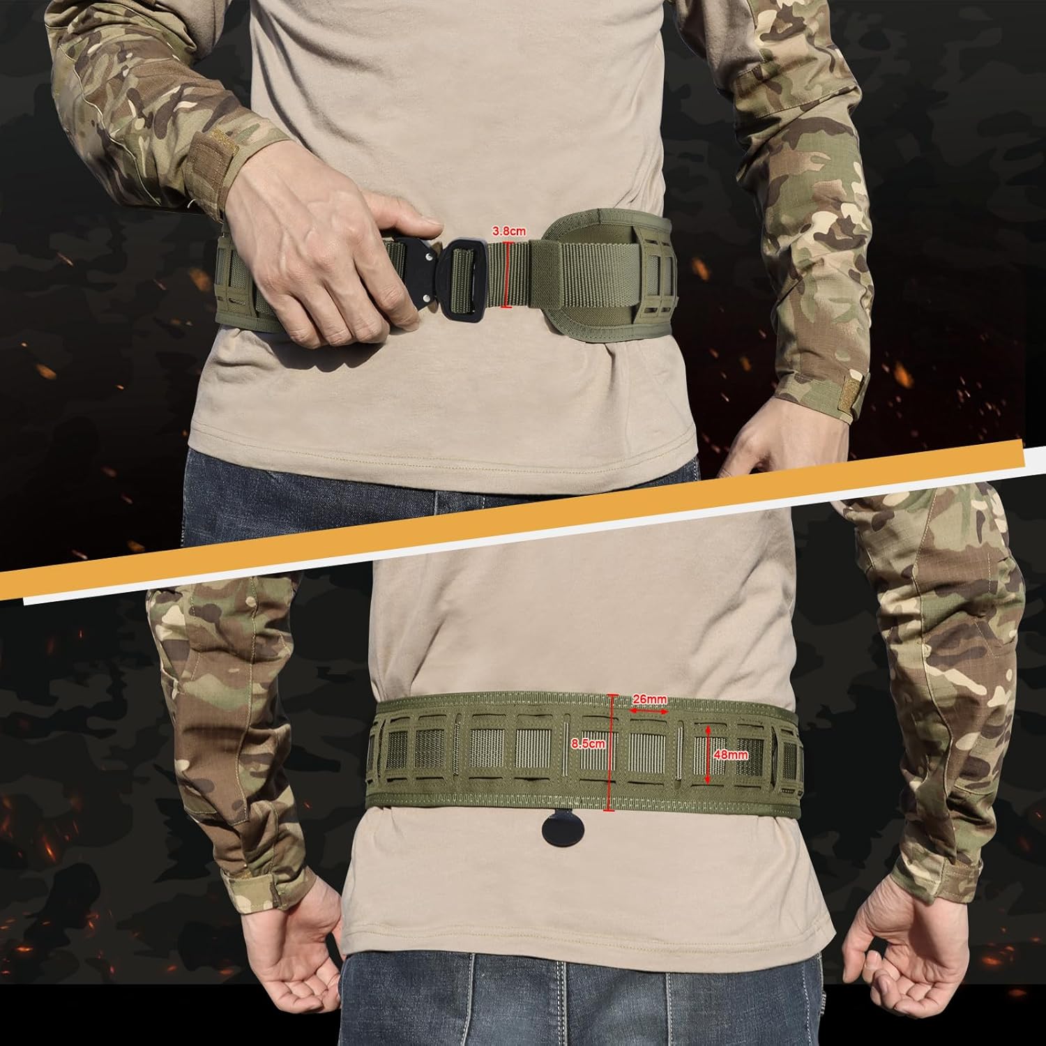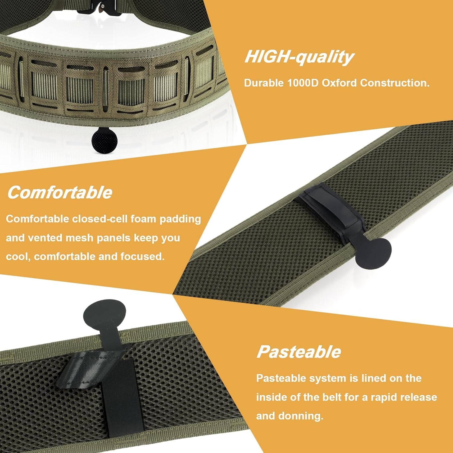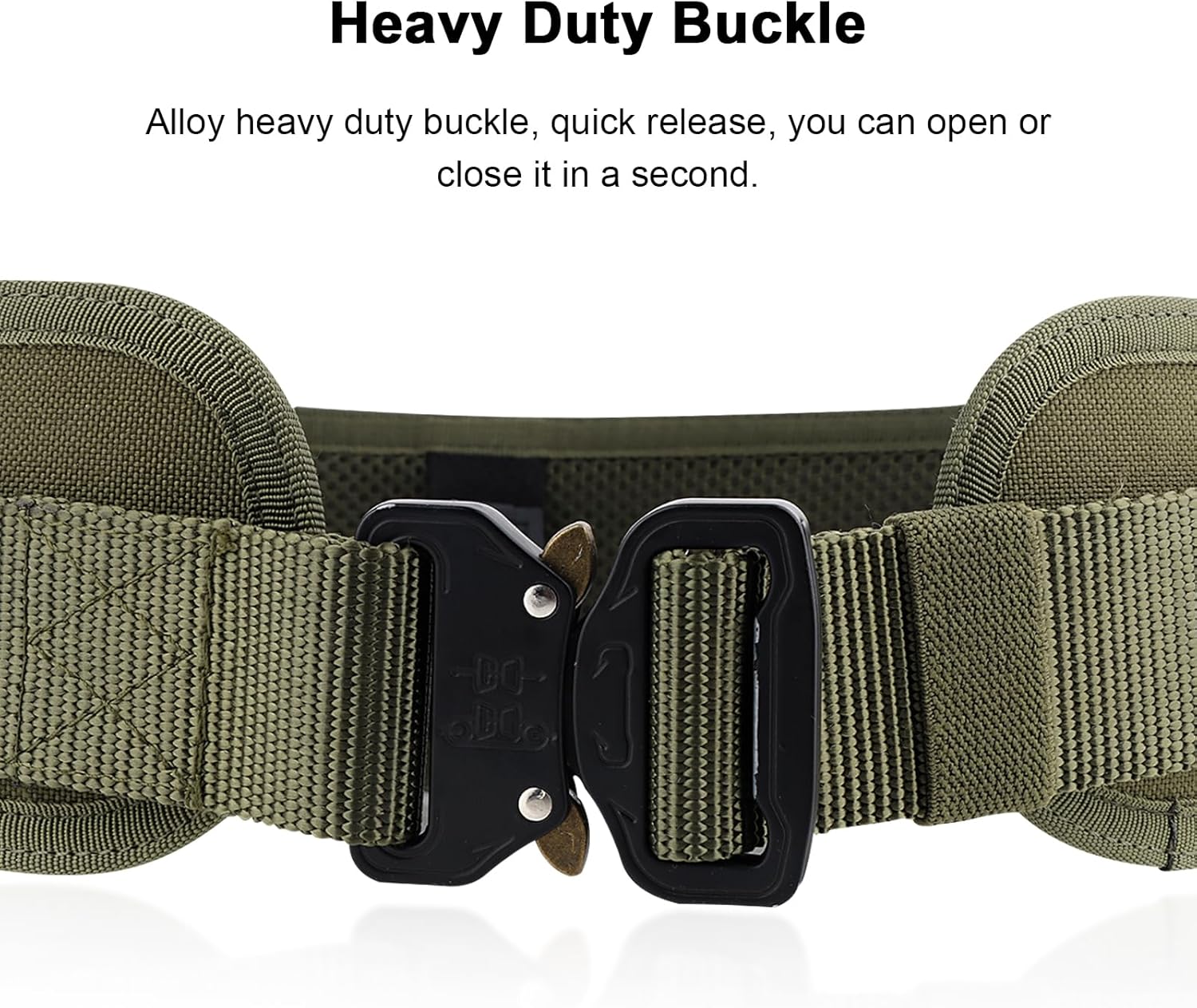 FOCUHUNTER Tactical Belt Molle, 1000D Nylon Waist Patrol Belts with Quick Release Buckle, Multi-Purpose Adjustable Waist Padded Patrol Belts for Outdoor Sports EquipmentSpecificationsColors: Black & Khaki & Camo & GreenMaterial: 1000D Oxford NylonUnisex Men & WomenStyle: Tactical/Sport/OutdoorLength: 83~116cm / 32.68~45.67 inWidth: 8cm / 3.15 inFits Belt: 6cm / 2.36 inItem Weight: 379g / 13.36 ozPackage Weight: 405gPackage Size: 19.5x10x28cm / 7.68x3.94x11.0 inPackage Contents1x Tactical Belt (Molle Belt Pad & Length Adjustable Waist Belt)1. Molle Belt: You can customize and attach utility pouches and accessories of your choosing.2. Adjustable Length: Change the length according to the different waist type.3. Easy to Use Buckle: Strong buckle, quick release and easy to use.4. Two Metal Hooks: Can used together with molle vest.5. Breathable & Comfortable: Padded for extra comfort with a mesh interior for breathability and flexibility.6. Non-slip Padding: Keeps the belt stable and in position.