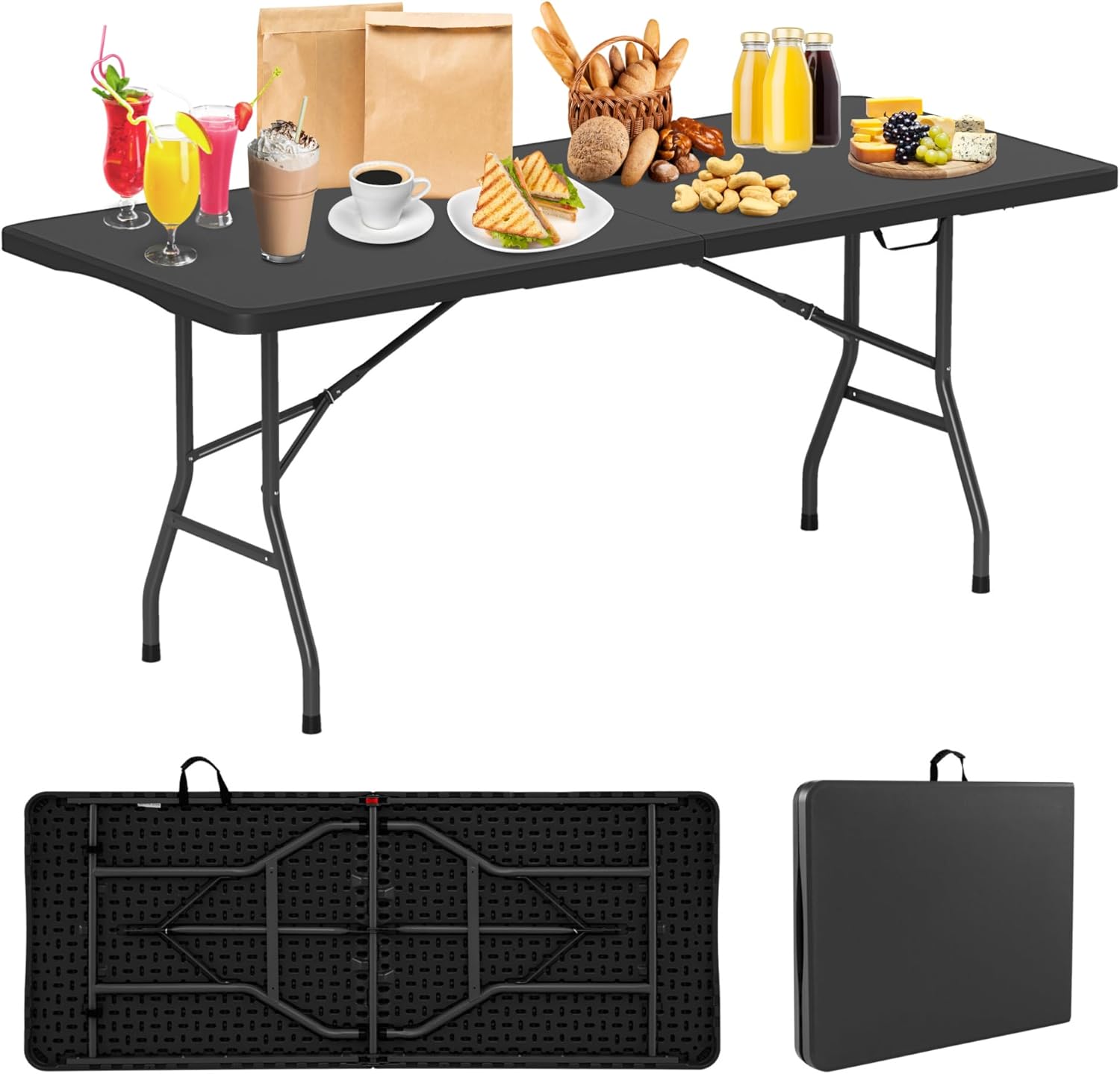 Description:The versatile folding table enhances your outdoor activities with convenience and functionality. Constructed with a premium HDPE material, this Patio Table features a weatherproof tabletop that is sun-proof, water-resistant, and anti-fading for enduring outdoor use. The honeycomb construction at the back ensures stability. The large tabletop measures 6/8 x 2.5 ft, offering ample space. Heavy-duty metal legs are coated for long-lasting, anti-deformation, and superior strength. Folding design with carrying handle allows for easy transport. Its versatility makes it suitable for various activities like picnics, camping, kitchen use, or studying.Features:HDPE Material is sunproof, water-resistant and anti-fading for long-lasting useHoneycomb construction on the back of the tabletop ensures higher stabilitySpacious 6/8 x 2.5 ft tabletop provides generous space for diningReinforced with robust metal legs with anti-slip footpadsEquipped with a safety lock and joint locks with high securityPortable folding table with 24 lbs/36.5 lbs net weightPerfect for dining, camping, picnic, barbecue, party, etcEasy to set up and take down within secondsSpecifications:Color: Black/Gray/WhiteMaterial: HDPE, MetalOverall Dimension: 71"/96.5" x 29" x 29.5"/180/245 x 74 x 75 cm (L x W x H)Folding Dimension: 35.5"/48.5" x 29" x 3"/90/123 x74 x 8 cm (L x W x Thickness)Weight Capacity: 350 lbs/160 kgNet Weight: 24 lbs/11 kg 36.5 lbs/16.5 kgPackage Includes:1 x Folding Table1 x Instruction
