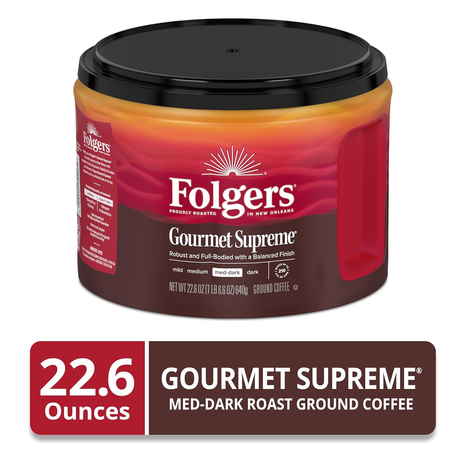 If you enjoy the rich and flavorful depth of a medium dark roast coffee, Folgers Gourmet Supreme ground coffee is just what you need to start the day right. Carefully crafted by our expert Roast Masters, this supremely delicious coffee features a blend of robust and full-bodied flavors you’re sure to love. Brew it your way using the home coffee maker of your choice. (Tip: Folgers Gourmet Supreme ground coffee is especially well-suited for cold brewing or for use in a French press.) It’s The Best Part of Wakin’ Up, with a special twist. Stock up now to elevate your every day.
