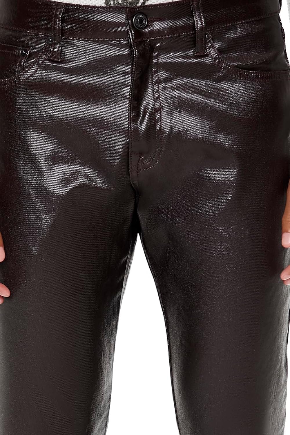 Crafted from stretch-denim, this pair of slim-fit jeans features a shiny coated finish, five-pocket construction, and belt loops.
