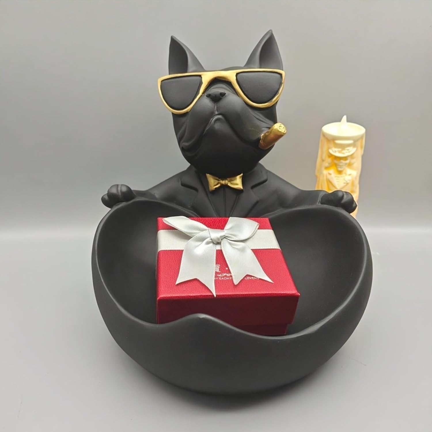 Add a touch of sophisticated whimsy to your home with this stylish French Bulldog key bowl. This matte black resin sculpture features a dapper bulldog wearing gold-toned sunglasses and a bow tie, creating an eye-catching decorative piece that's both functional and fashionable. Measuring 7.50 inches long and 8.27 inches tall, this versatile organizer is perfect for storing keys, phones, candy, or other small essentials in style. The bowl's generous cavity provides ample storage space while maintaining its decorative appeal. The detailed craftsmanship is evident in every aspect, from the bulldog's expressive features to its sleek formal attire. Whether placed in your entryway, on a desk, or as a centerpiece, this unique accessory adds character to any room while keeping your belongings organized. The sturdy resin construction ensures durability for everyday use, while its sophisticated design makes it an excellent gift choice for dog lovers and design enthusiasts alike.