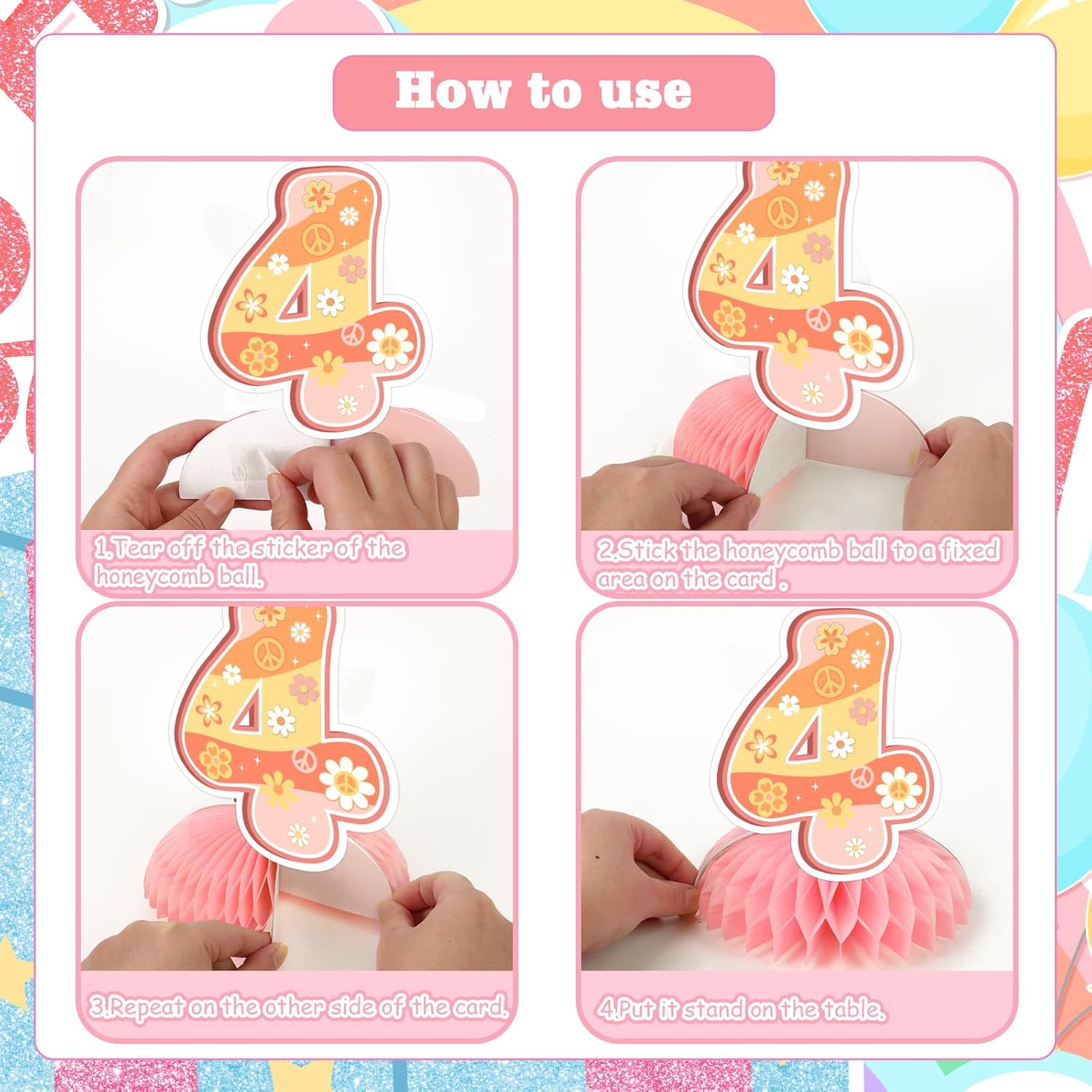 Package includes:8 x groovy 4th birthday honeycomb centerpiecesHow to use:1.Tear off the sticker of the honeycomb ball2.Stick the honeycomb ball to a fixed area on the card3.Repeat on the other side of the card4.Put it stand on the table