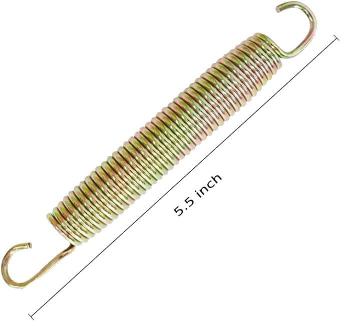 Premium trampoline springs are made with a colored zinc coating, providing 50% more durability, excellent protection against rust and corrosion, and a longer lifespan than regular galvanized steel springs. Specifications for 5.5 Inches Springs: Diameter: 0.949 inches Number of Coils: 30 Thickness: 3.24 mm Number of Springs: 10 Specifications for 7.25 Inches Springs: Diameter: 0.965 inches Number of Coils: 39 Thickness: 3.35 mm Number of Springs: 10 Specifications for 8 Inches Springs: Diameter: 0.98 inches Number of Coils: 46 Thickness: 3.10 mm Number of Springs: 10 Specifications for 9 Inches Springs: Diameter: 0.97 inches Number of Coils: 49 Thickness: 3.5 mm Number of Springs: 10 Specifications for 9 Inches Commercial Grade Springs: Diameter: 1.26 inches Number of Coils: 46 Thickness: 3.55 mm Number of Springs: 10