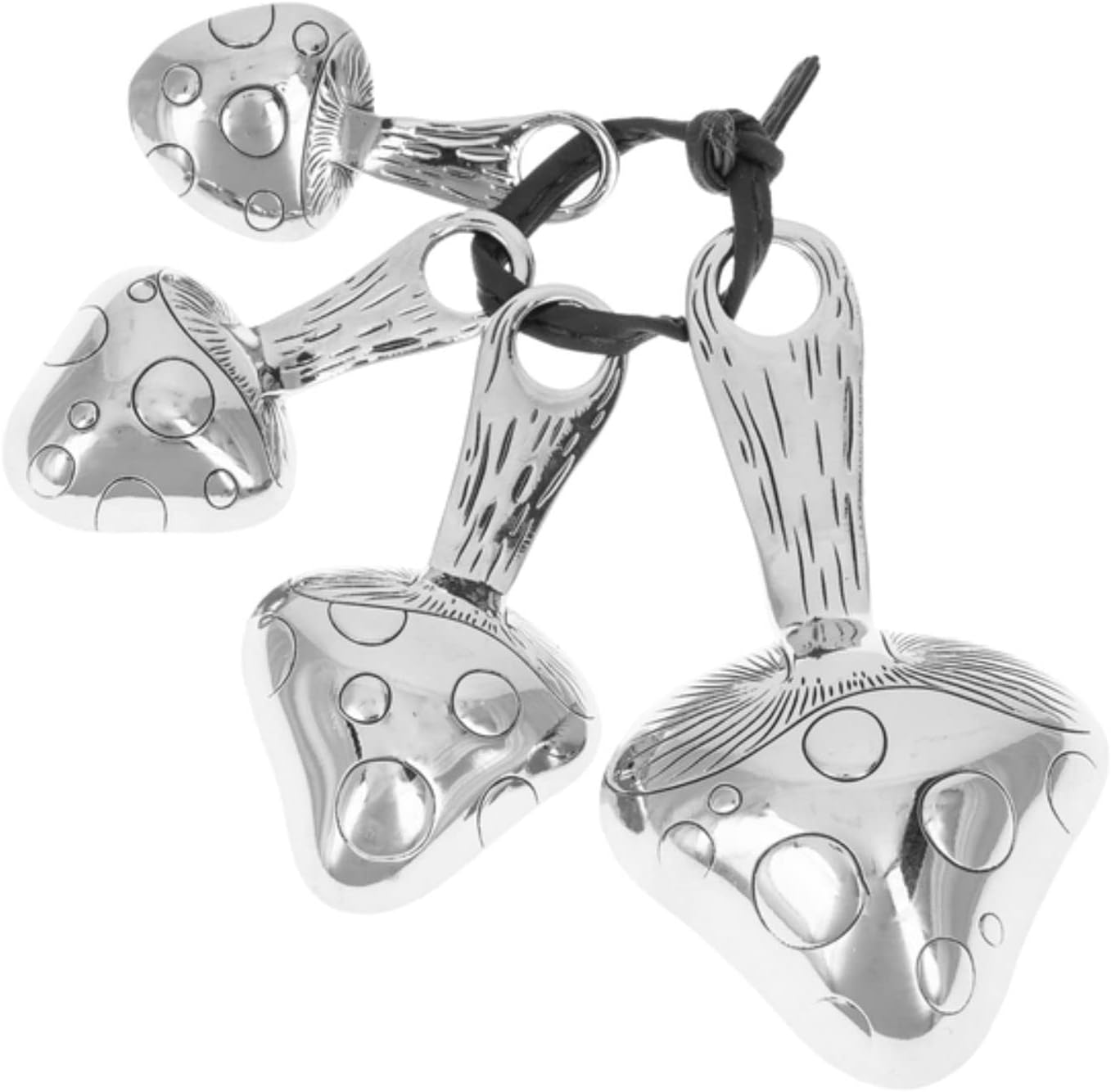 Charming set of decorative and functional measuring spoons. Features a polka dot mushroom shape and design on spoon portion. Set of 4 includes 1 Tbsp., 1 Tsp., 1/2 Tsp., and 1/4 Tsp. Hand washing recommended. Made of zinc alloy. Boxed and ready for gift giving.
