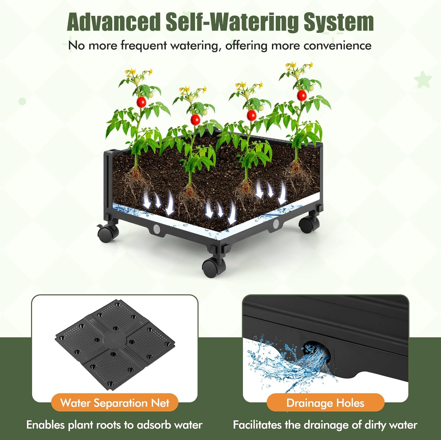 Description: Experience the ultimate in gardening versatility with this innovative garden bed and trellis combo. The sturdy obelisk trellis, featuring PE-coated metal tubes, safeguards your climbing plants from scalding. Individually or combined, the roomy PP planter boxes expand your growing horizons, with a self-watering mechanism that keeps your greens lush and vibrant. Effortless relocation is a breeze with the garden bed’s universal wheels, complete with lockable brakes for secure positioning. Create a personalized garden oasis with this modular system, accented by an adorable bird adornment and complete with protective gloves. As needed, the planter box with trellis is perfect for multi-scene use, like patio, deck, greenhouse, and more. More details await your discovery. Features: Advanced self-watering system to avoid frequent watering Comes with a water separation net that enables plant roots to adsorb water Facilitates the drainage of dirty water thanks to the drainage holes PE-coated metal tubes to prevent scalding of plants and can serve for a longer time Reinforcing crossbars provide reliable support for diverse climbing plants Planter box made of premium PP material for optimal durability Designed with a top decorations, making it a centerpiece in your garden Equipped with 360° swivel wheels and 2 with brakes for effortless movement Has a separable design for versatile use in the garden, greenhouse, or balcony Buy more to create a larger planting area using the combinable design Features easy-to-install cross arms to achieve a simple installation Suitable for climbing plants, like clematis, morning glory, Chinese rose, and more No more frequent watering, offering more convenience Specifications: Color: Black Material: PE-Coated Metal, PP Overall Dimensions: 16” x 16” x 81” (L x W x H) Height of Planter Box: 6.5” Load Capacity of Planter Box: 33 lbs Net Weight: 6.5 lbs Package Includes: 1 x Garden Bed with Trellis 1 x Pair of Gloves 11 x Fixation Straps 2 x Top Decorations 1 x User Guide