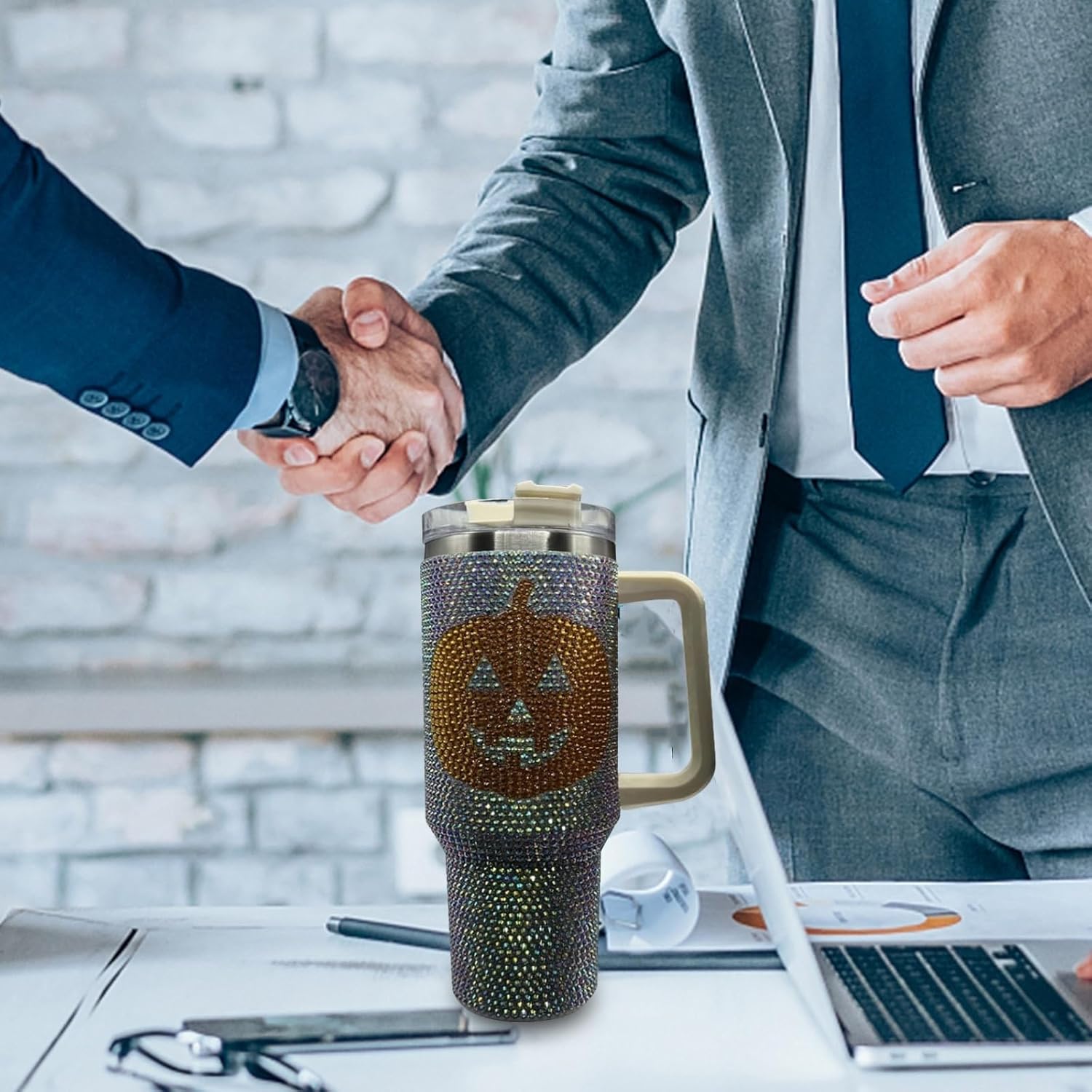 Features:1: Outdoor Adventures: Whether you're hiking, camping, or enjoying a day at the beach, the 40oz tumbler is a fantastic companion. Its durable stainless steel construction can withstand the rigors of outdoor activities, and it keeps your drinks at the right temperature regardless of the weather.2: Fitness and Sports: Stay hydrated during workouts or sports activities by bringing your tumbler along. The convenient size fits in most gym equipment cup holders, and the insulation ensures your drink stays cold and refreshing during even the most intense workouts.3: Gift Giving: The 40oz tumbler also makes for an excellent gift. Whether it's a birthday, holiday, or special occasion, this tumbler is a thoughtful and practical present for anyone who appreciates quality drinkware.3: Constructed from high-quality stainless steel, our tumbler boasts exceptional durability, ensuring it will withstand the test of time. This material also provides excellent temperature retention, keeping your hot beverages piping hot for up to 8 hours and your cold drinks refreshingly chilled for up to 12 hours. Say goodbye to lukewarm coffee or watered-down iced tea; our tumbler is here to maintain your desired drink temperature throughout the day.Specifications:Materias: Stainless Steel and RhinestonesCapacity: 1200ML/40OZSize: Perfect sizePackage including: 1 * 40oz Halloween Pumpkin Tumbler with Handle and Straw