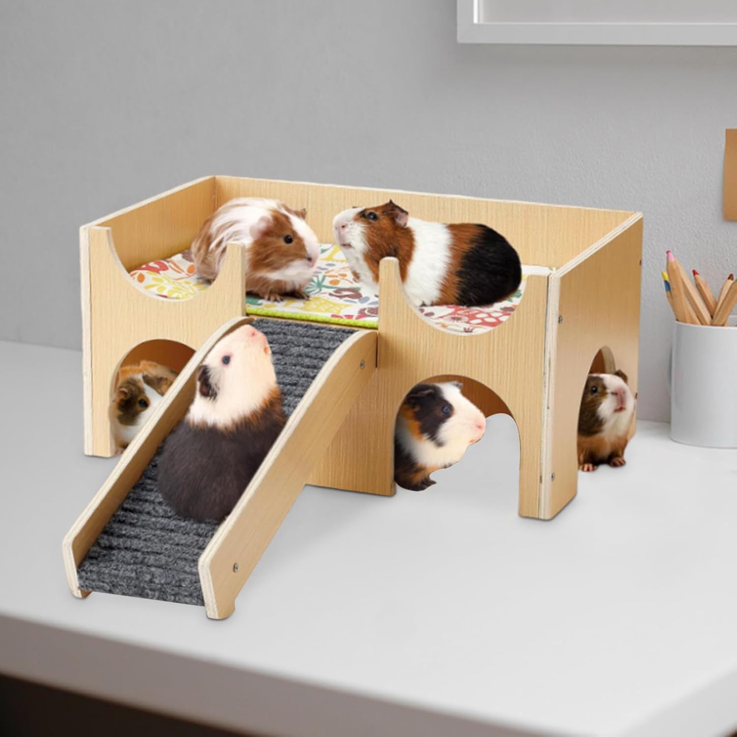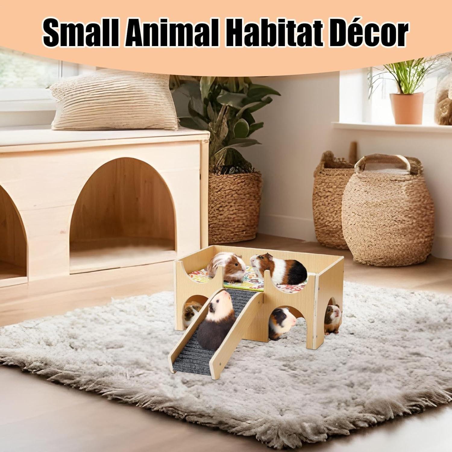 Create an ideal living space for your pet with the Hamster House. Featuring a climbing ladder stairs and hideouts it supports exercise and exploration. Suitable for hamsters gerbils hedgehogs guinea pigs and bunnies this habitat comes with accessories to encourage activity and comfort for all small animals.Specifications:Product name: Hamster HouseProduct size: about 23.7x38x18cm/9.33x14.96x7.09 inchesProduct weight: 1300gMaterial: woodProduct List:1 * Hamster HouseNote:Due to different lighting and screen settings, the item color may be slightly different from the picture.Due to different manual measurements, please allow a 1-2cm difference in size.