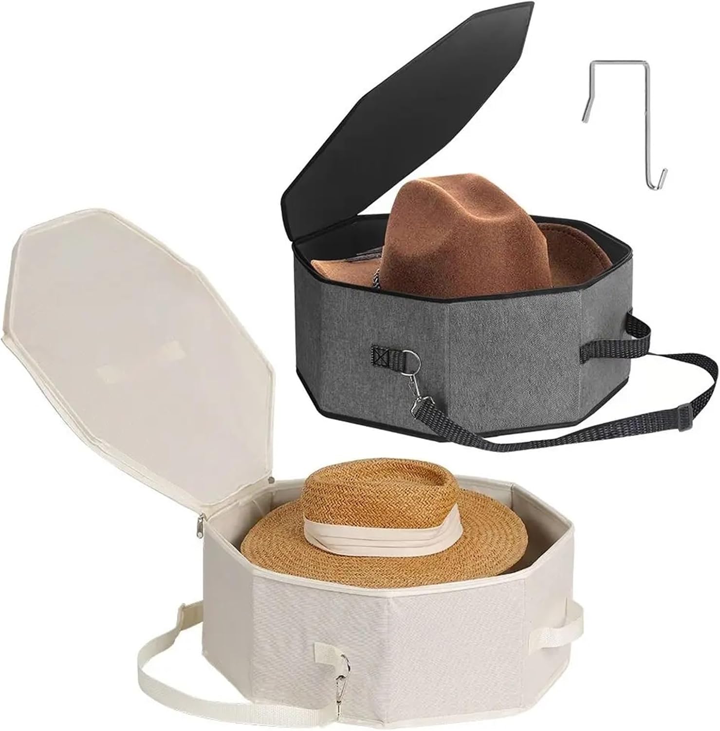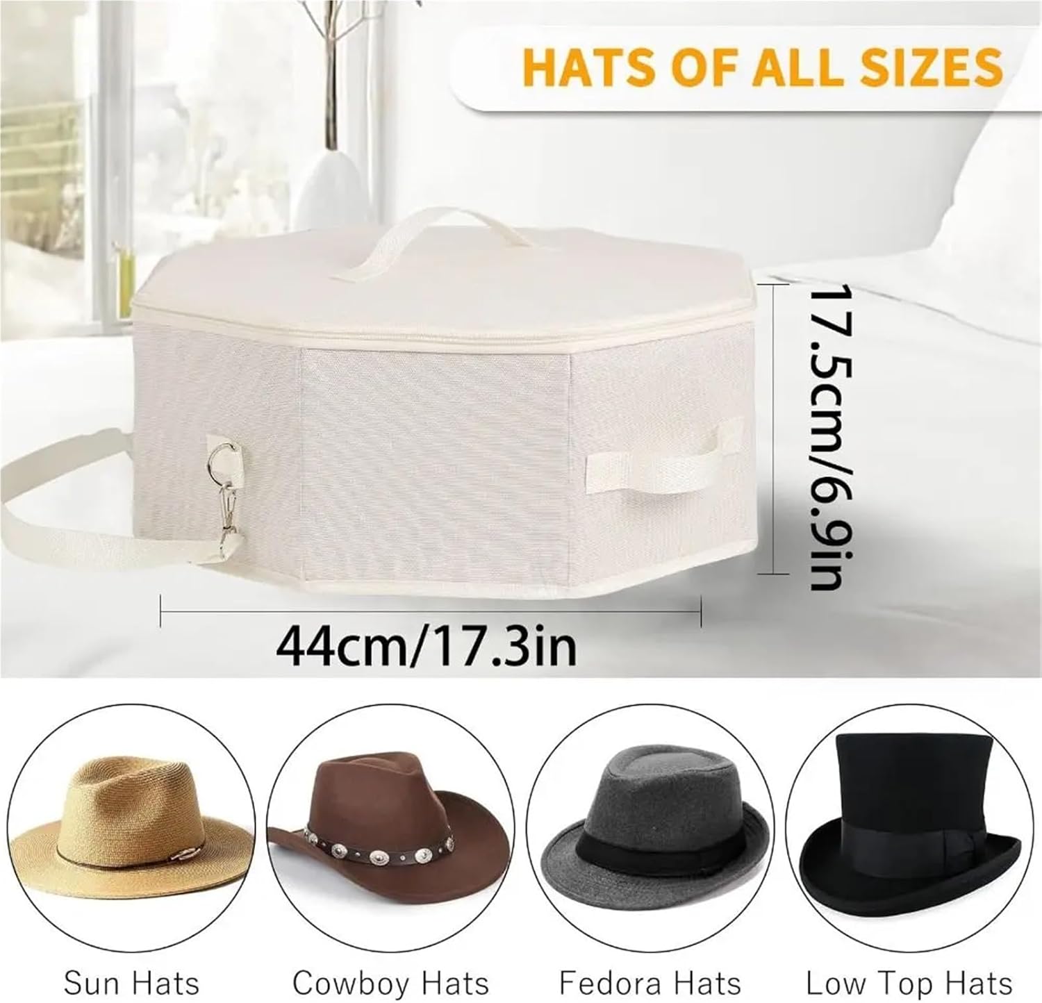 Color: Gray,BeigeMaterial: Oxford ClothSpecial Feature: Dustproof,Shoulder Strap,Large CapacitySize: 44*17.5cm(17.32*6.89in)Package Includes: 1pc Foldable Hat Case,1pc Hook
