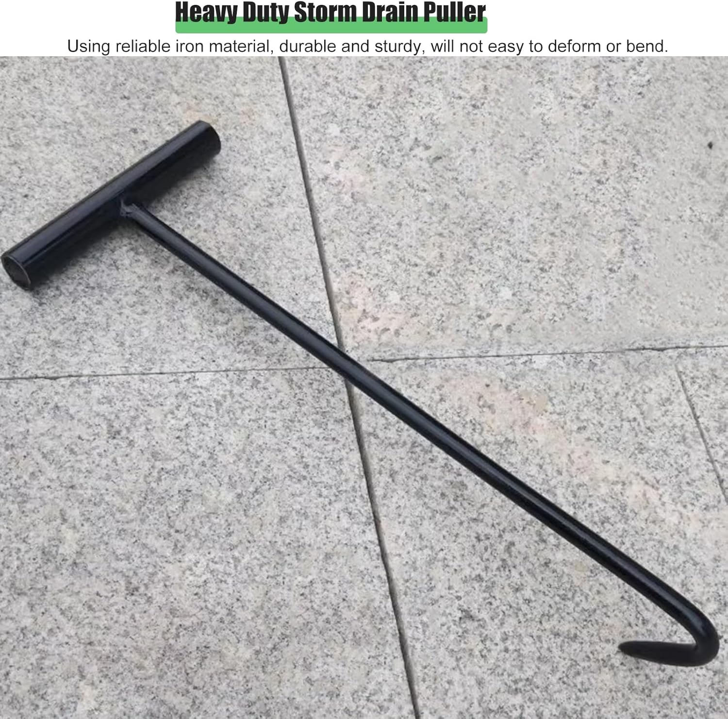 Stainless Steel Manhole Lifter Lid Hook: Product DescriptionAre you finding it challenging to lift manhole covers or rolling doors? Our Stainless Steel Manhole Lifter Lid Hook is designed to make these tasks safer and easier. Crafted from durable iron, this tool ensures reliability and strength, allowing you to lift heavy covers with confidence. Its thoughtful design prioritizes your safety, shielding your hands from potential injuries during use.Key Features:- Versatile Applications: Ideal for various tasks, including lifting storm drain grates, septic tank covers, and roll-up doors, this lifter meets all your lifting needs.- Ergonomic Design: The T-style handle provides a secure grip, making it easy to maneuver without falling off during use.- Effective Hook Design: The specially designed hook securely grabs the cover, offering a reliable lifting solution.- Easy Maintenance: The hook is easy to clean with just water, ensuring it stays in top condition for every use.- Durability Guaranteed: Made from strong iron, this tool resists bending and deformation, promising longevity.- Practical Usage: With precise craftsmanship, this manhole lifter withstands wear and tear, making it an essential addition to your toolkit.Specifications:- Material: Iron- Color: Black- Sizes Available: Diameter options of 8mm, 10mm, and 12mm; lengths of 10in (25cm), 14in (35cm), 18in (45cm), 22in (55cm), 26in (65cm), and 30in (75cm).- Hook End Length: 1.6in (4cm)- Handle Width: 5in (13cm)Package Includes:- 1 x Manhole Cover Lifter