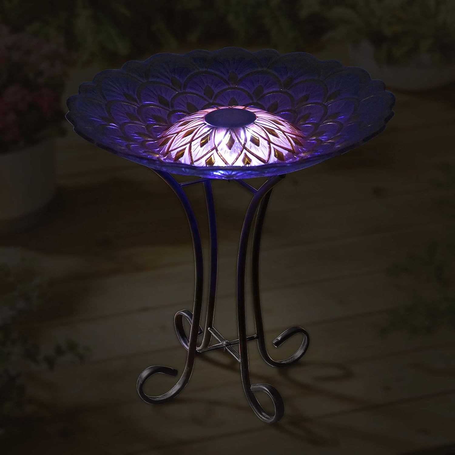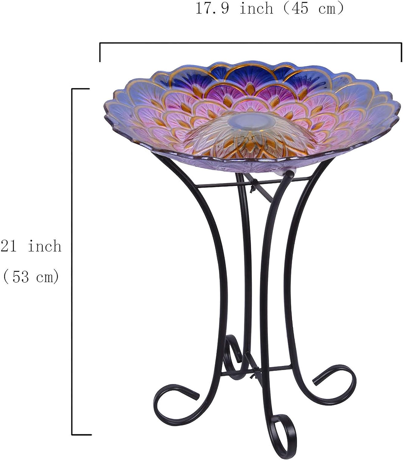 Stunningly designed with a large colorful bowl, This glass solar birdbath with stand will attract your backyard Birds for hours of viewing pleasure. A four-legged metal stand is included & the solar panel lights up in the darkness.