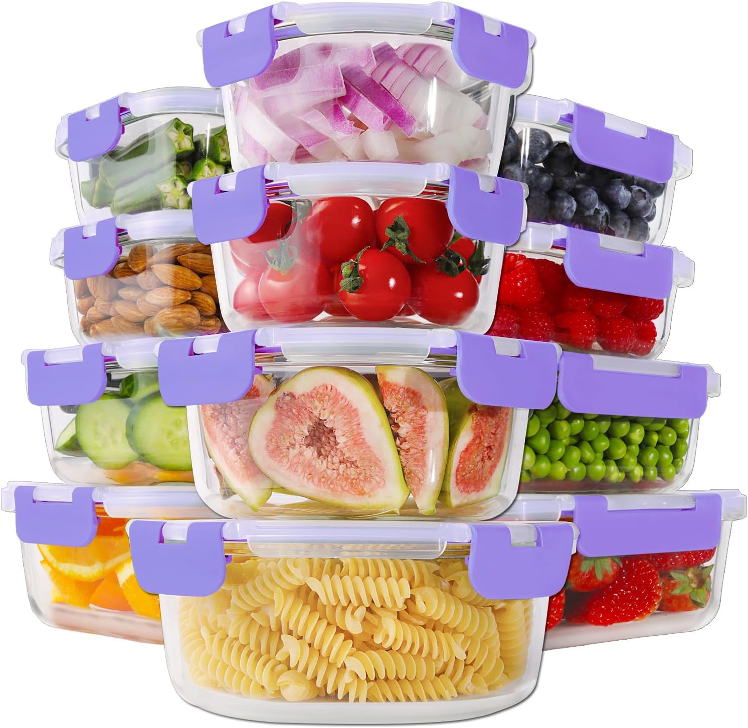 HOMBERKING 24 Pieces Glass Food Storage Container Set (12 lids & 12 containers)Including 3 different types and 9 volumes for your needs:12 PCS Lids2 PC of 370 ml Rectangle Glass Container, 6.02"x4.41"x3.07", 13oz/1.6cup1 PC of 630 ml Rectangle Glass Container, 6.93"x5.2"x2.52", 22oz/2.7cup1 PC of 1040 ml Rectangle Glass Container, 8.15"x6.06"x2.76", 35oz/4.5cup2 PC of 310 ml Square Glass Container, 4.76"x4.76"x2.83", 11oz/1.4cup1 PC of 530 ml Square Glass Container, 5.39"x5.39"x2.52", 18oz/2.3cup1 PC of 800 ml Square Glass Container, 6.34"x6.34"x2.7", 28oz/3.4cup2 PC of 390 ml Round Glass Container, 5.39"x2.48", 14oz/1.7cup1 PC of 640 ml Round Glass Container, 6.22"x2.76", 22oz/2.7cup1 PC of 970 ml Round Glass Container, 7.09"x2.99", 33oz/4.1cupOur containers are made of safe and environmentally friendly material:The main body of the container - Transparent borosilicate glassThe lid of the container - BPA-Free plastic Snap Locking Lids & White silicone sealing stripThey can be used from -4℉ – 752℉ (-20℃ – 400℃).Oven safe(Not the lids)Microwave safe(Not the lids)Freezer safeDishwasher safe(Not the lids)Tips:1. In order to prevent the rubber seal strips sticking to the glass containers, please make sure wash and wipe dry the lids and glass containers before put them away.2. It is safe to wash the lids in the dishwasher, but high temperatures over a long period of time can deform the rubber seal strips at the edge of the lids. In order to extend service life of rubber seal strips, please wash the lids by hands as much as possible.3. If you have any questions, please contact us in any time.We'll get back to you in 24 hours.