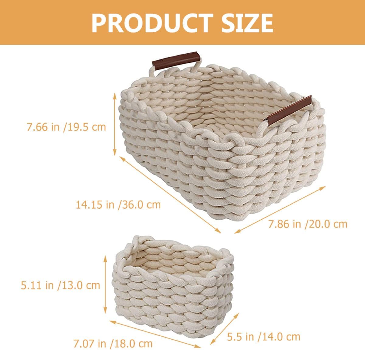 Package Include 1 × Large Cotton Rope Woven Basket 2 × small Cotton Rope Woven Baskets Characteristics - Size: 36.00X20.00X19.50cm/14.15X7.86X7.66in -Product Info:Storage basket - Color: White -Material:Cotton rope and leather - Size: 18.00X14.00X13.00cm/7.07X5.50X5.11in - Its wonderful workmanship ensures the practicality and durability for home bedroom or living room use Cotton Rope Storage Basket. - Elegant and simple design, suitable for any room in the house. Ideal for storing small items such as , etc. small woven baskets - The woven basket is a great way to store sundries or decorate your house, apartment or other living space organizing baskets. - The basket is made of cotton rope and leather, comfortable material, which can withstand the long-term use. - Handmade with craftsmanship. Soft material for comfortable touch. Lightweight and easy to carry. Goods Informationsmall rope basket Unique and decorative cotton rope woven storage basket made of good material.Rope Baskets For Storage It can be used to store various foods, snacks and desktop sundries.bathroom organizer basket It has a reasonable design and suitable size.cotton rope basket for shelves It can be used for daily storage.Storage Baskets The basket is reasonable, simple and practical, fashionable and versatile, a good choice for home storage.small woven baskets Simple yet practical, more convenient to use