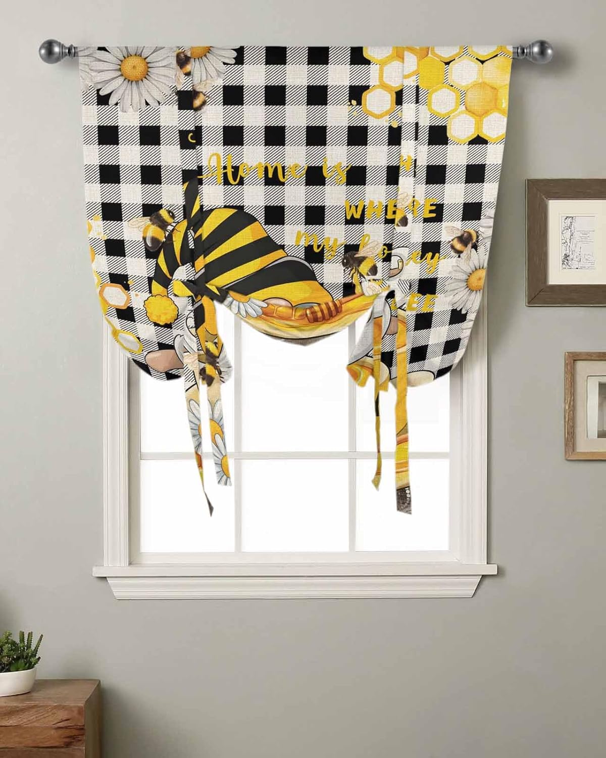 AMZRicher Brand are constantly offering a variety of kitchen curtains, living room sheer curtains, outdoor mailbox cover, table runners, outdoor wind spinner, potholders, cloth napkins, chir back cover and other home articles in different designs, which can meet any matching decorating needs. We will help you find designs that dazzle and ensure that you will live life in style.Our mission is to offer premium jacquard valance curtains with long-lasting material in pursuit of long-lasting happiness, liven up your home decorations.Tie Up Curtains Valance Details:Material: Durable and sturdy polyester blend.Features: Soft, comfortable, wrinkle free, soundproof, thermal insulated, fadeproof, lighting filtering, lightweight but thick enough.Rod Pocket: 4'' pole pocket fits for most market rods.Designs: Vivid colors, various patterns, high definition printing, providing patterns with floral/ animal/ rustic/ country/ farmhouse/ retro/ flowers/ plaid/ check/ stripes/ geometric/ marble/ leaf/ modern/ abstract/ contemporary/ ombre/ cartoon and so on to brighten your room.Versatile Scenarios: Adjustable ties fits for windows in different size: small/ large as valances or long curtains. Suitable for bay window, sunroom, kitchen, living room, bedroom, bathroom, café, office, hotel, camper, rv, etc.Install Guide:1. Hang tie up curtains firstly. There are both 2 ties on the shade left and shade right. Flip 1 tie on the front of the curtain and the other still on back.2. Decide the enough height you need. Tie the two ties together on the left curtain, and the same of the right ties.3. From left to right, fold the curtains up from bottom to bow ties, and then insert the curtains to the tie loop.Care Instruction:Machine wash in gentle cycyle, do not bleach, tumble dry.