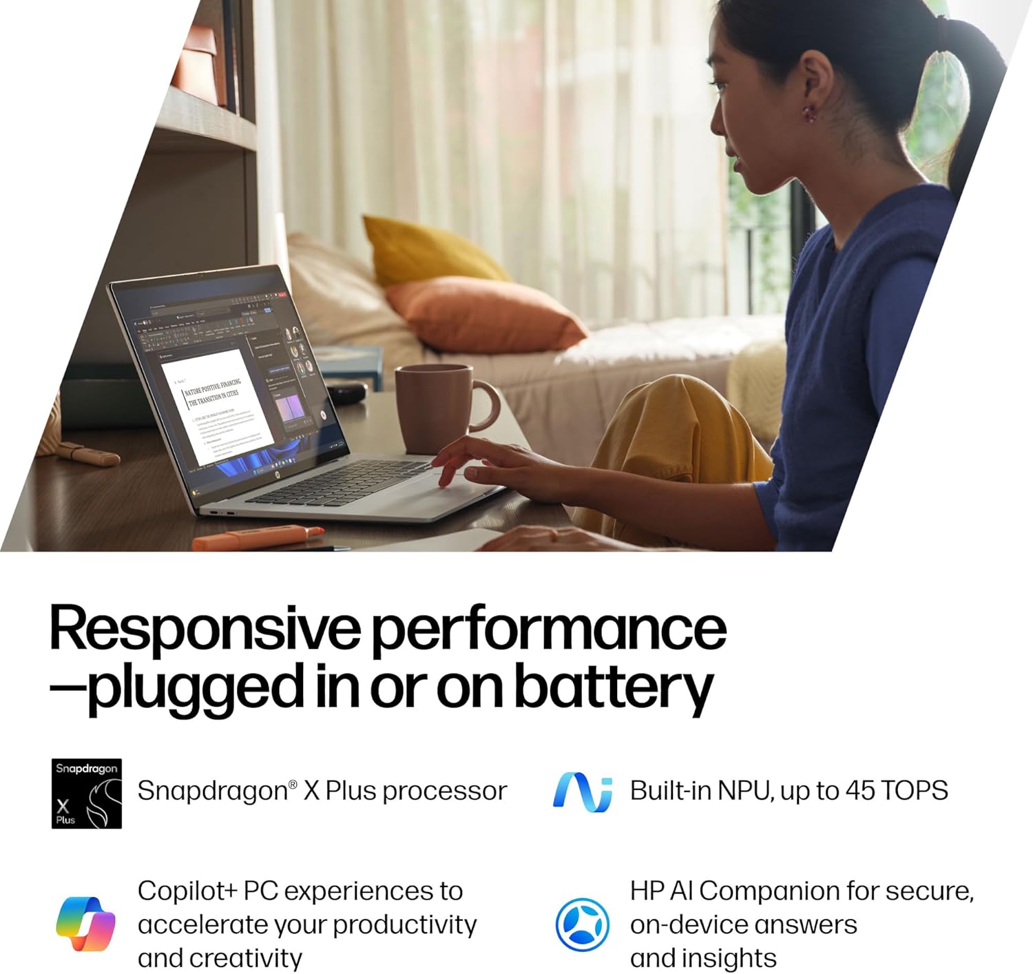 The HP OmniBook 5 14 inch AI PC, with the responsive Snapdragon X Plus processor, delivers AI-driven performance and an incredible battery life, so you can go all day and leave the charger behind. Your personal on-device assistant, HP AI Companion, helps streamline your workflow—no subscription required. The extensive battery life is engineered for efficiency, even with heavy multitasking and intensive workloads. Powered by Snapdragon X Plus and the dedicated AI engine that boosts speed and efficiency, you'll experience advanced computing performance in an ultra-thin profile that's designed for an easy on-the-go lifestyle. Enjoy a stunning audio-visual experience. The 2K OLED touch display brings rich colors and deep contrast to every frame. Dual speakers with HP Audio Boost deliver immersive, high-quality sound, and the 1080p FHD IR camera ensures you always look your best on video calls. The HP OmniBook 5 Next Gen AI PC comes with a 65 W USB Type-C power adapter and goes from 0 to 50% charge in 30 minutes. Plus, it contains recycled materials and is built with ocean-bound plastic in bezel and speaker enclosures, recycled metal in top cover and base, post-consumer recycled plastic in keyboard keycaps and scissors. HP is here to help. This HP computer comes with 1-year limited hardware warranty and 1-year limited technical support for software and initial setup with 24-hour, 7 days a week web support when shipped from and sold by Amazon.com.