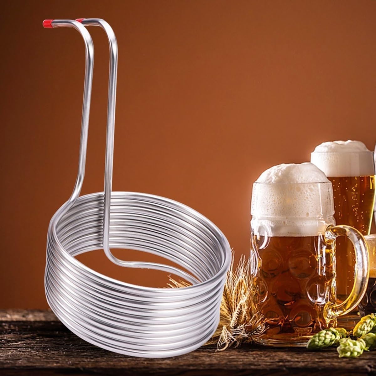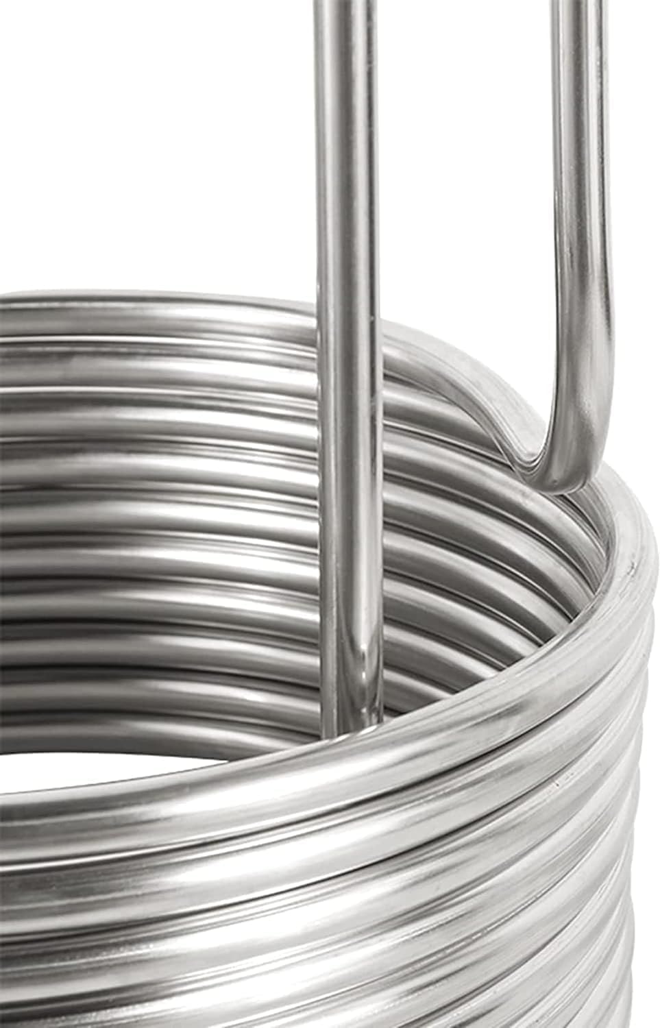 What Is an Immersion Chiller?Brewery cooling device that consists of a length of coiled tubing.You drop the apparatus directly into the hot wort, and then connect with cooling fluid(usually is tap water from faucet).As the cool water flows through the coil, it absorbs heat from the wort mix and therefore reduces its temperature.Specification:Material: 304 Stainless SteelOverall Height: 37.5cmTube inner diameter :0.8cm Tube outer diameter :1cmTube Thickness: 0.5mmCoil Length: 8MCoil Height: 10cmCoil Width: 23.5cmPackage Include:1 x Immersion Chiller