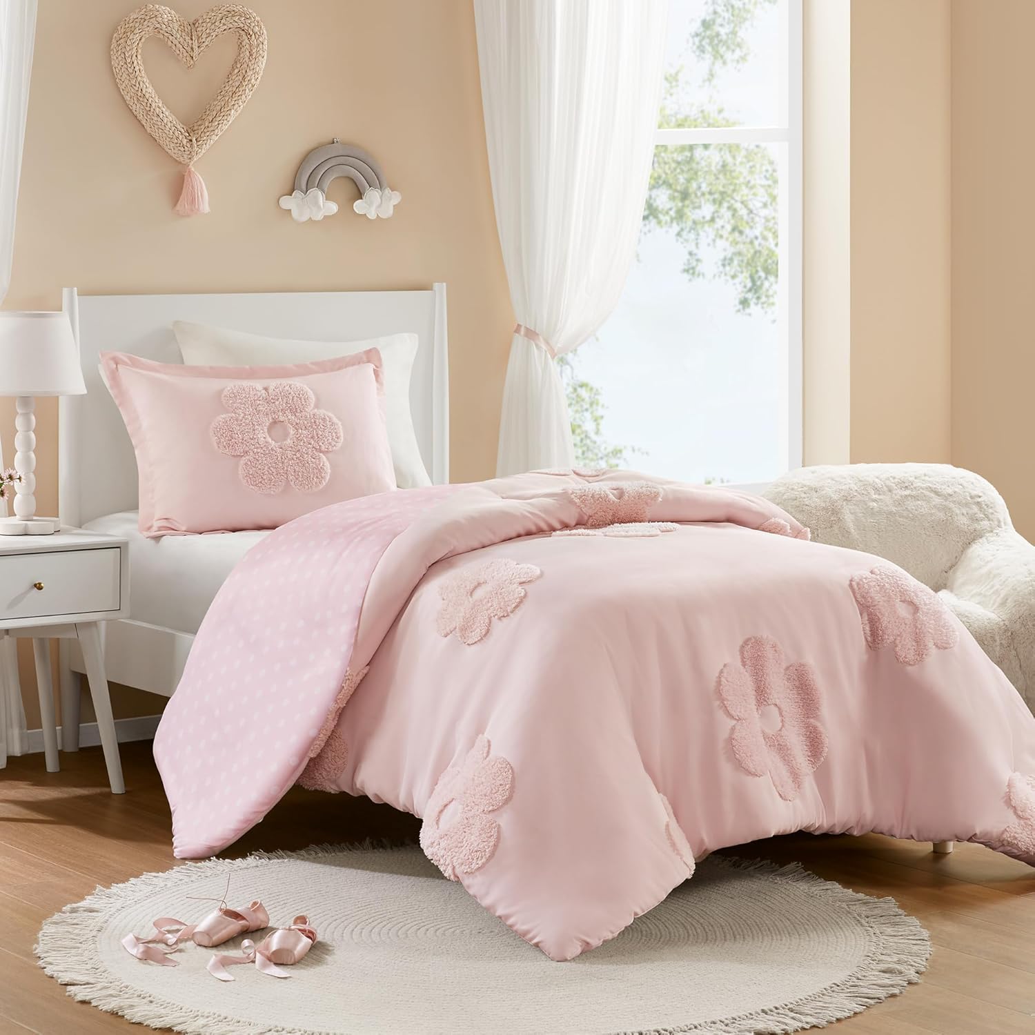 The Intelligent Design Kids Gracie duvet cover set features a charming floral tufted chenille design in purple, pink, and aqua on one side and a coordinating polka dot reverse on the other, giving your child two fun options to style their bed. This duvet cover adds a touch of charm and whimsy to their room with its colorful, soft chenille texture. Also included are coordinating shams (1 in Twin) to complete this kids bedding set. This machine washable kids duvet cover set is OEKO-TEX certified, made with materials that are gentle on your child’s skin for everyday comfort you can trust.. A button closure at the foot end allows you to place a padded insert within the duvet cover and internal corner ties prevent it from shifting. Inserts for duvet covers are sold separately.