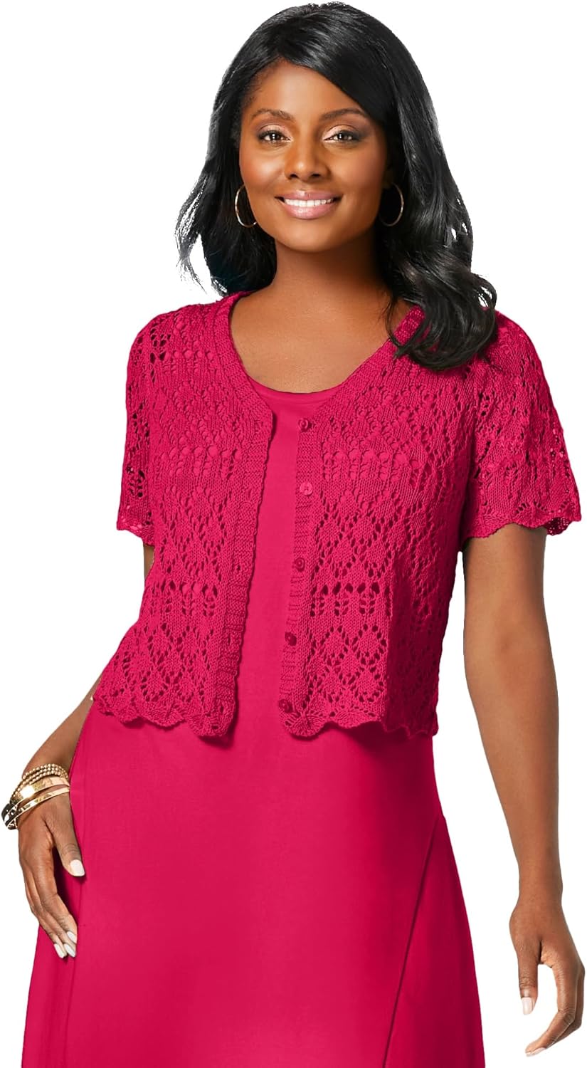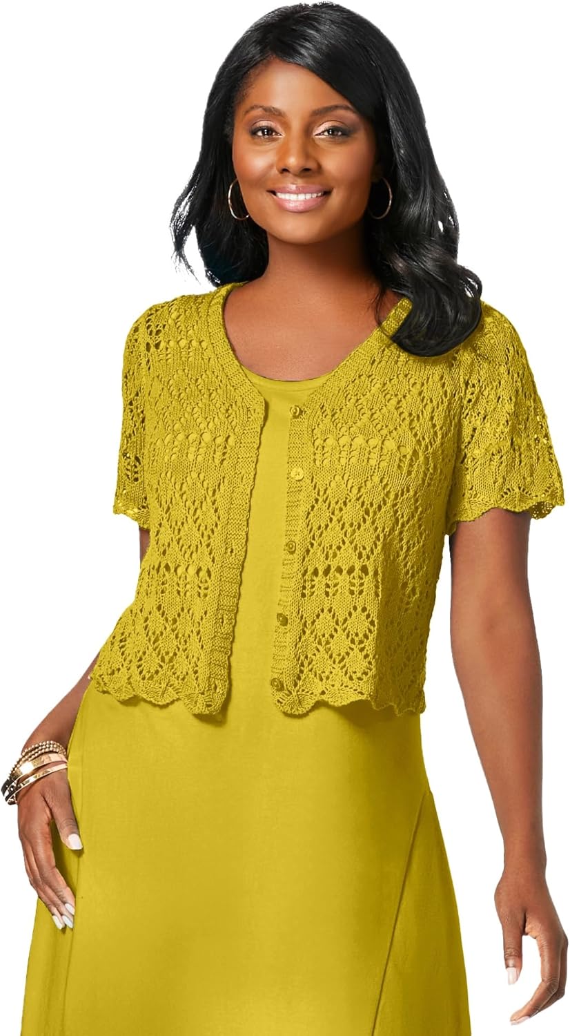 This simple yet elegant crochet shrug is the perfect layer with all your sleeveless dresses. An airy, stylish must-have you'll reach for time and again. Straight silhouette br> V-neckline br> Button front br> Short sleeves br> 20" length br> Cotton/ramie br> Machine washable br> Imported