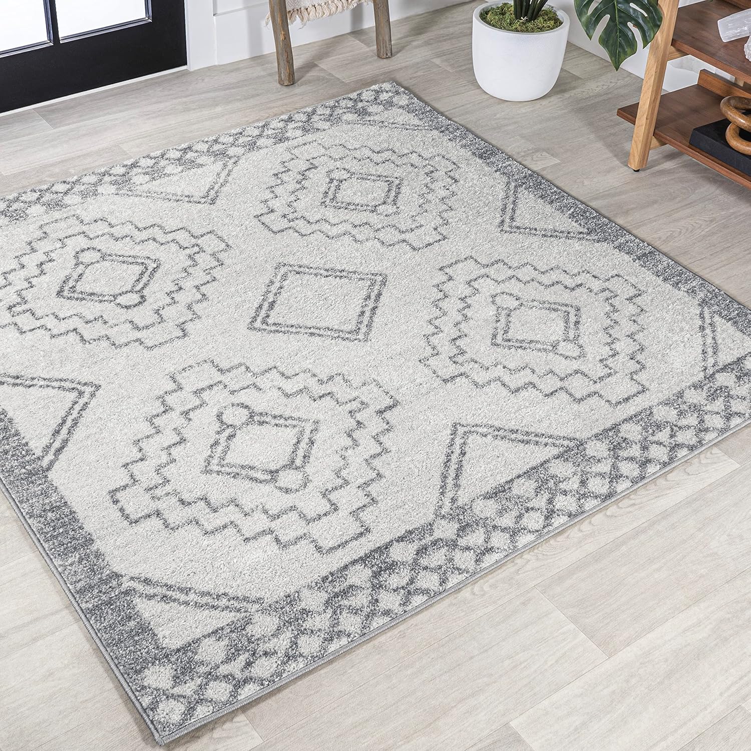 Moroccan influences abound in the geometric design of this rug. Shades charcoal black create a lively medallion design against a deep ivory background. Add graphic impact to a modern room, or make this rug part of your Boho-chic story.