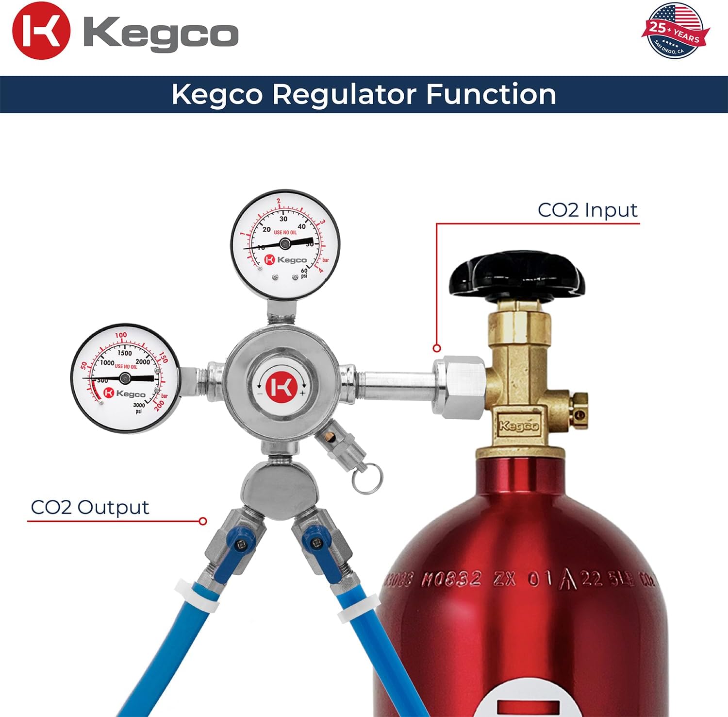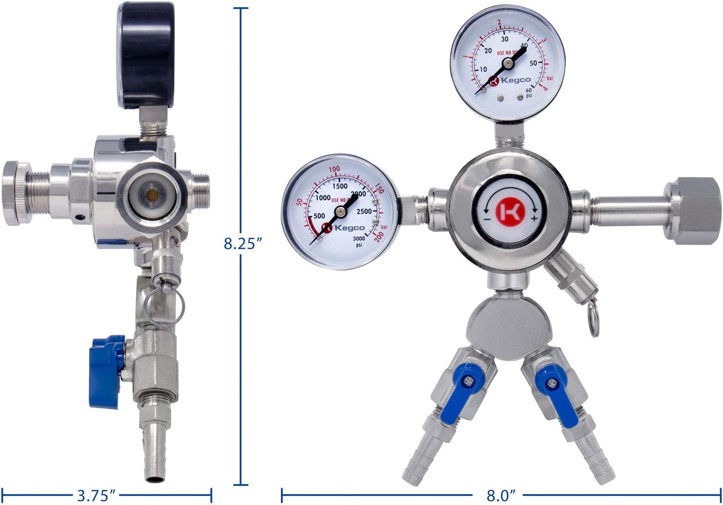 This Pro Series dual-output double gauge regulator is loaded with high end features! If you plan on dispensing two separate kegs but do not need to have independent keg pressures, then this regulator will work for you. This regulator has a Y Splitter with two independent shut off valves, so you can still run a single keg if you want to. The pressure adjustment knob can be turned by hand so it does not require tools. It also features a pressure release valve so you can release pressure from the system at the regulator. This is great a great feature if you have a keg coupler that does not include a pressure release valve.