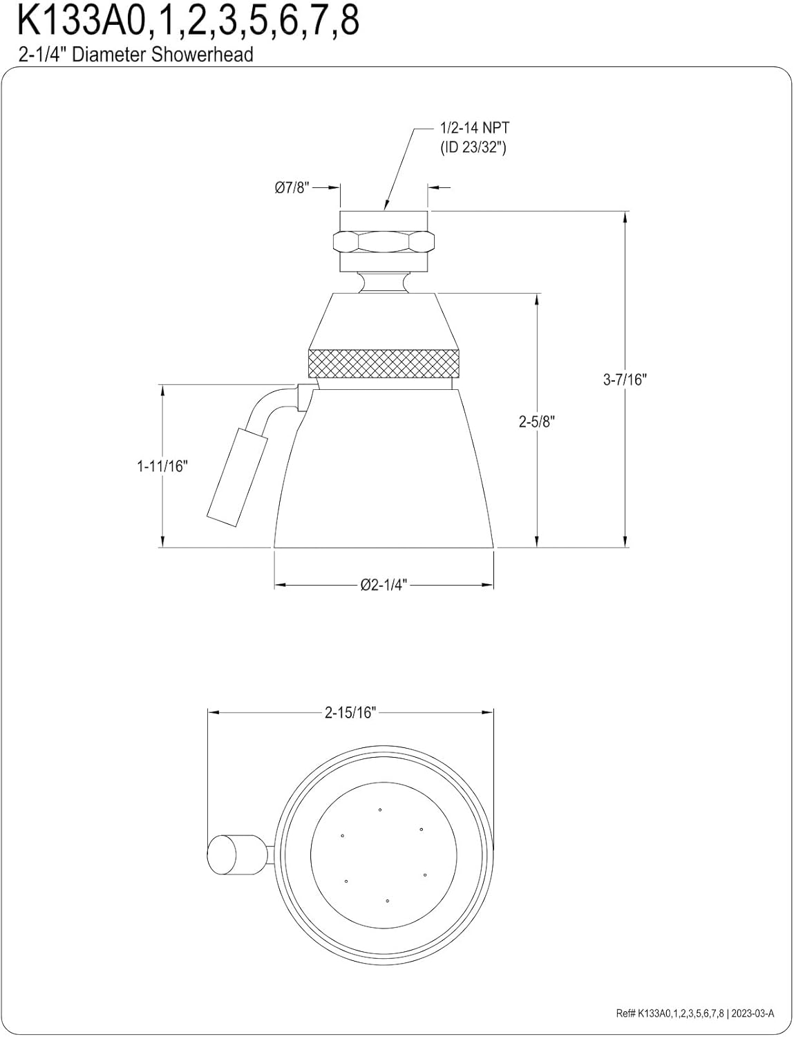 Product Description Fabricated from solid brass material for durability and reliability, Premium color finish resist tarnishing and corrosion, 2-1/4" diameter spray face. Polished Chrome Finish. High Quality Brass Construction. 2-1/4" Diameter Shower Head. Matching Accessories Available. Max 1.8 GPM/6.8 LPM Water Flow Rate At 80 PSI. Compliant with ASME 112.18.1. Showerhead Flow Rate: 2.5. Showerhead Width: 2.25. Showerhead Height: 3.75. Showerhead: Adjustable Shower Head. Pray Settings: 1. Spray Pattern: Full Spray. Spray Nozzles: 6. Finish: Chrome. Material:. Style:. Dimensions: From the Manufacturer Fabricated from solid brass material for durability and reliability, Premium color finish resist tarnishing and corrosion, 2-1/4-Inch diameter spray face. Timeless Design offered you with a solution for both premiere home decor and legendary durability. All products come with a generous product warranty. Many Hardware Accessories are made to match faucets to complete your home into a designer estate.