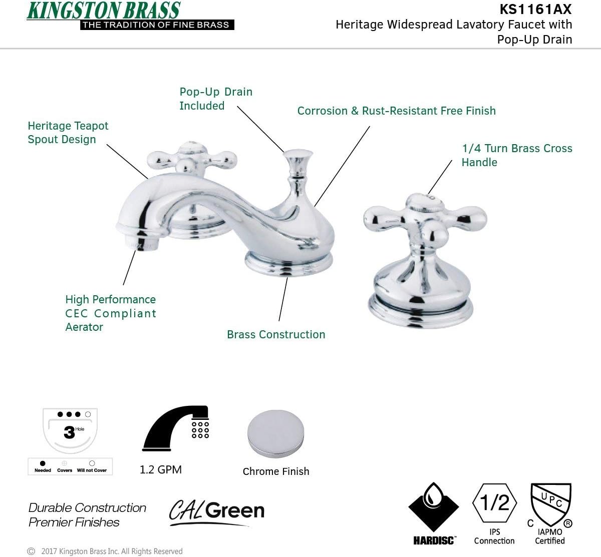 Product Description Includes all mounting hardware. Classic style. Two handle deck mount. Three hole sink application. 8 in. to 16 in. widespread. Premium color finish resists tarnishing and corrosion. 0.25 turn on or off water control mechanism. 0.5 in. IPS male threaded shank inlets. Ceramic disc cartridge. Max 1.2 GPM/4.5 LPM water flow rate at 60 PSI. Integrated removable aerator. 5.5 in. spout reach from faucet body. 3.5 in. overall height. Drip-free ceramic cartridge system. Designed for a lifetime of performance. Meets ASME a112.18.1, ANSI or NSF 61 sec. 9 code. Made from brass. Polished chrome finish. Made in Taiwan. From the Manufacturer Functional and Stylish Faucets Gives an Irresistible Beauty to the Bathroom. Design is Perfectly Co-Ordinated to Match the Bathroom decor. Kingston Brass Faucets Meet ASME Standard for Durable and Reliable Performance. Wide Selections of Different Designed Handles are Available and are Flexible to Change the Faucet Looks in Many Ways to Match the Bathroom Styles. Timeless Design offered you with a solution for both premiere home decor and legendary durability. All products come with a generous product warranty. Many Hardware Accessories are made to match faucets to complete your home into a designer estate. This item cannot ship to CA or VT.