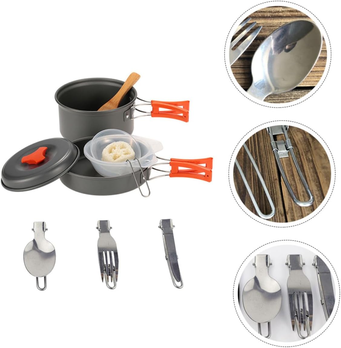 Package Include 1 x Cooking Pot 1 x Fry Pan 1 x Soup Spoon 1 x Rice Scoop 1 x Loofah Cleaner 2 x Plastic Bowls 1 x Storage Bag 3 x Tablewares Characteristics -Size(Frying Pan): About 15.50X3.50cm/ 6.10X1.38in(Handle: About 10cm/ 3.94in.) camping cooking essentials -Size(Rice Scoop): About 16.00X7.80X2.00cm/6.29X3.07X0.78in camping utensils metal -Product Info:Picnic pot set -Color: Grey, Orange camping kitchenware -Size(Pot): About 14.50X14.50X8.00cm/ 5.70X5.70X3.14in outdoor camping cookware -Size: 24.50X14.50X8.00cm/9.63X5.70X3.14in outdoor cookware -Material: Aluminum Alloy camping cooking gear -Size(Bowl): About 11.00X4.00cm/ 4.33X1.57in multifunctional camping cookware -The outdoor cookware set is easy to clean under the water directly cooking utensil camping kit. -Cooking kits are designed for 1-2 people and come equipped with enough kitchen essentials camp cooking utensils. -Widely suitable for picnic, hiking, camping, climbing, BBQ and other outdoor activities camping cookware portable. -With portable design, the cookware is convenient for you to store when they are not used camping cooking utensils. -You can enjoy without second guessing with these cooking tools outdoor cooking utensil camping kit.Goods Descriptioncamping tableware A complete and durable cookware for camping, hiking, backpacking, picnic, day trips, family parties, lightweight and portable.outdoor camping cookware Do you want to have some camping cookware? Then, our camping cookware is carefully prepared for you
