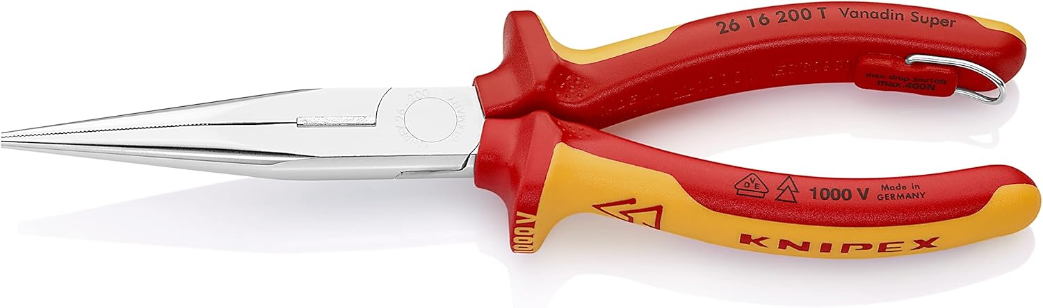 Elastic tips; stable even when twisted. Distortion-tolerant, flexible precision tips. Half-round, long, pointed jaws . Snipe nose side cutting pliers also known as stork beak pliers. Hardened cutting edges (approx. 61 HRC) for soft, medium hard and hard wire. Slim long nose is ideal for working in confined areas. Vanadium steel; forged, multi stage oil-hardened, chrome finish. 1000V multi-component grips, VDE-tested. Includes tether attachment point. For use with KNIPEX Tethered Tools System.