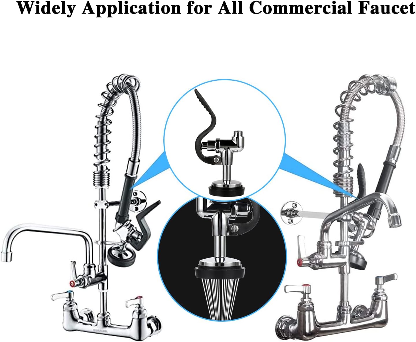 Black pre-rinse sprayer Spray Valve Features: -Surface Treatment: Multi-layer plating workmanship, polished chrome. -Material: Made of POM plastic, anti-aging. -Hand-free Design: Comes with a stainless steel ring, when you want to use the sprayer for an extended period of time it can be used to firmly hold the handle without manual operation. -Ergonomic Design: Ergonomic handle is comfortable for long time use, the handle is easy to turn back after use. -Easy Installation: Place the attached rubber ring between the handle and the hose, manually tighten them without any water tape. -Water Saving: Powerful water spraying hole, provide multi-dimension cleaning. More force, less Splash, save water. Specification: Color: Black Thread Size: 7/8"-20UNEF or 3/4-14 UNEF(remove that hand grip) Package List: 1* Pre-rinse Sprayer (Commercial faucet not included) 1* Stainless Steel Ring 1* Rubber Ring -Tips: Please note that it can't replace the G1/2" thread sprayer. Suitable for pre rinse Commercial sink Faucet which can NOT be attached on pull down kitchen faucet!