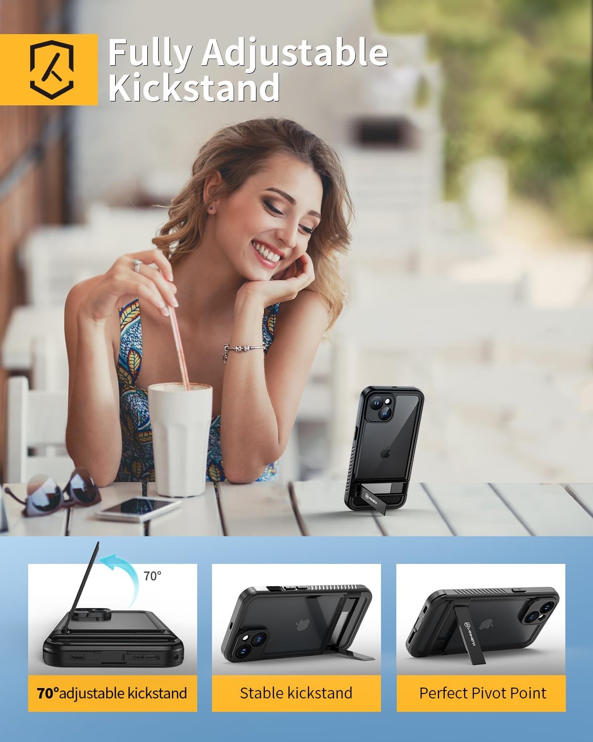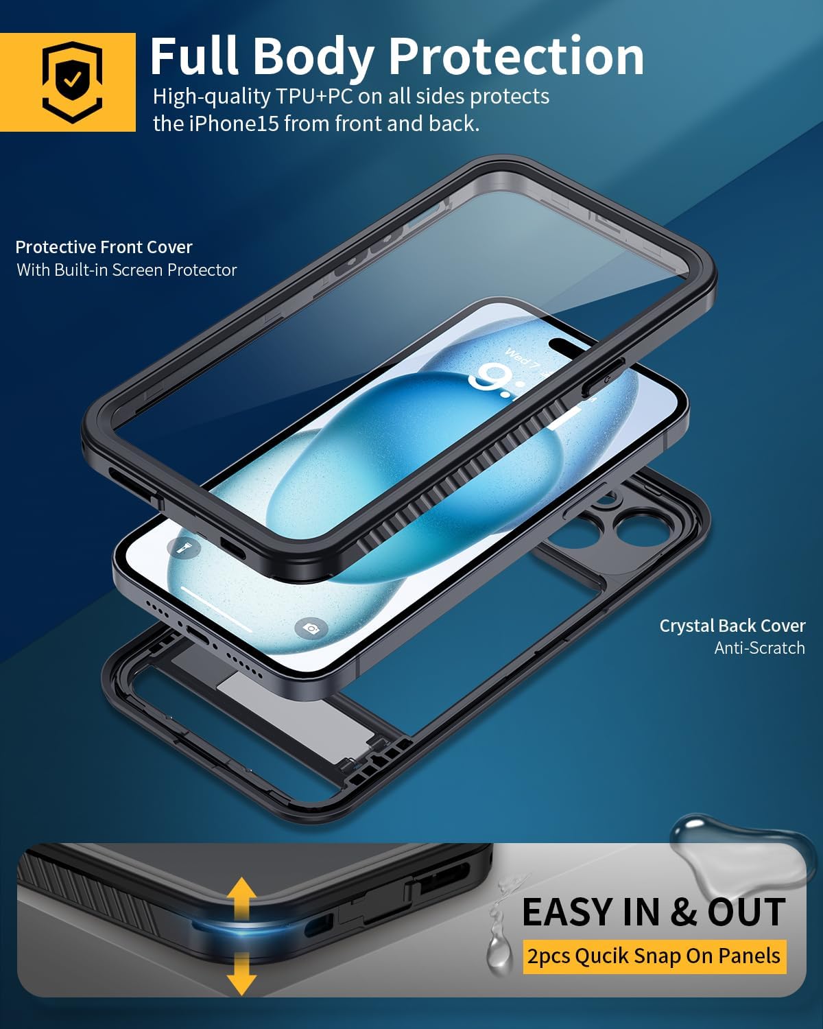 Lanhiem The best iPhone 15 companion for eternal focus on waterproof and shockproof design. Military sealed and air cushion shockproof design-We absolutely guarantee the safety of your iPhone I4:Exceeded IP68 standard waterproof, submersible up to 20ft/6m deep.Tough but soft material on case frame is more durable compared to other iPhone 15 waterproof cases for a better protection.Lanhiem iPhone 15 case with stand is waterproof, shockproof and dustproof with front/back scratch resistant clear screen protector. Designed to tested up to 6.6ft/2m drop.Ultra-thin & lightweight: 1.75oz/50g. 0.5 inch/13 mm thickness.Built in screen protector and kickstand. Easy to install, special sound enhancement system provides the best audio quality.100% access to Touch ID, audio/lightning ports, silent switch and volume/power buttons.Notes:A proper installation of this product is key to a successful protection, so please follow the user manual before each use.For a better experience, remove any pre-installed screen protector on your phone before installation.The size of the charging port opening is not big enough (only 12mm*6.5mm) for other replacement charger.Recommend to use original iPhone charging cable and earphone.What's in the Package:1* Lanhiem Case for iPhone 15 1* Alcohol cleaning kit1* Wrist strap1* User ManualWarranty Policy:Lanhiem will respond to your request within 24 hours! Also our 12 month replacement warranty and lifetime support guarantee can ensure you a confident purchase.