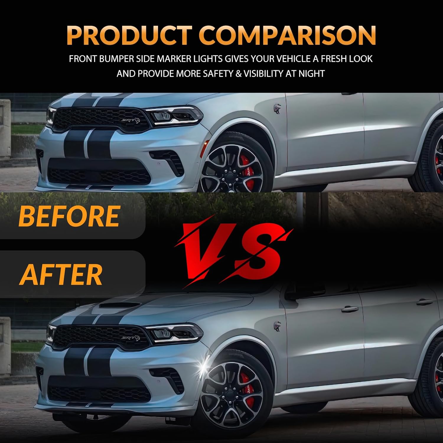LED Front Bumper Side Marker Lights for 2021-2025 Dodge Durango Marker Reflector Parking Signal Lamps Smoked Len, 2 PackCOMPATIBILITY:2021-2025 Dodge Durango OEM part number #: 68476818AA, 68476819AA.SPECIFICATION:LED Color: WhiteLEN Color: Smoked LenHousing Color: BlackVoltage: 12VMaterial: PC lens, ABS plastic housingPlacement on Vehicle: Front Bumper Side Marker Lamp5X Brighter than OEM BulbSimple Installation, plug & play, direct-fit replacement, no modificationNon-polarity, no need to worry about negative and positive connectionsPackage: 2x Side Marker Lights(Smoked Len)