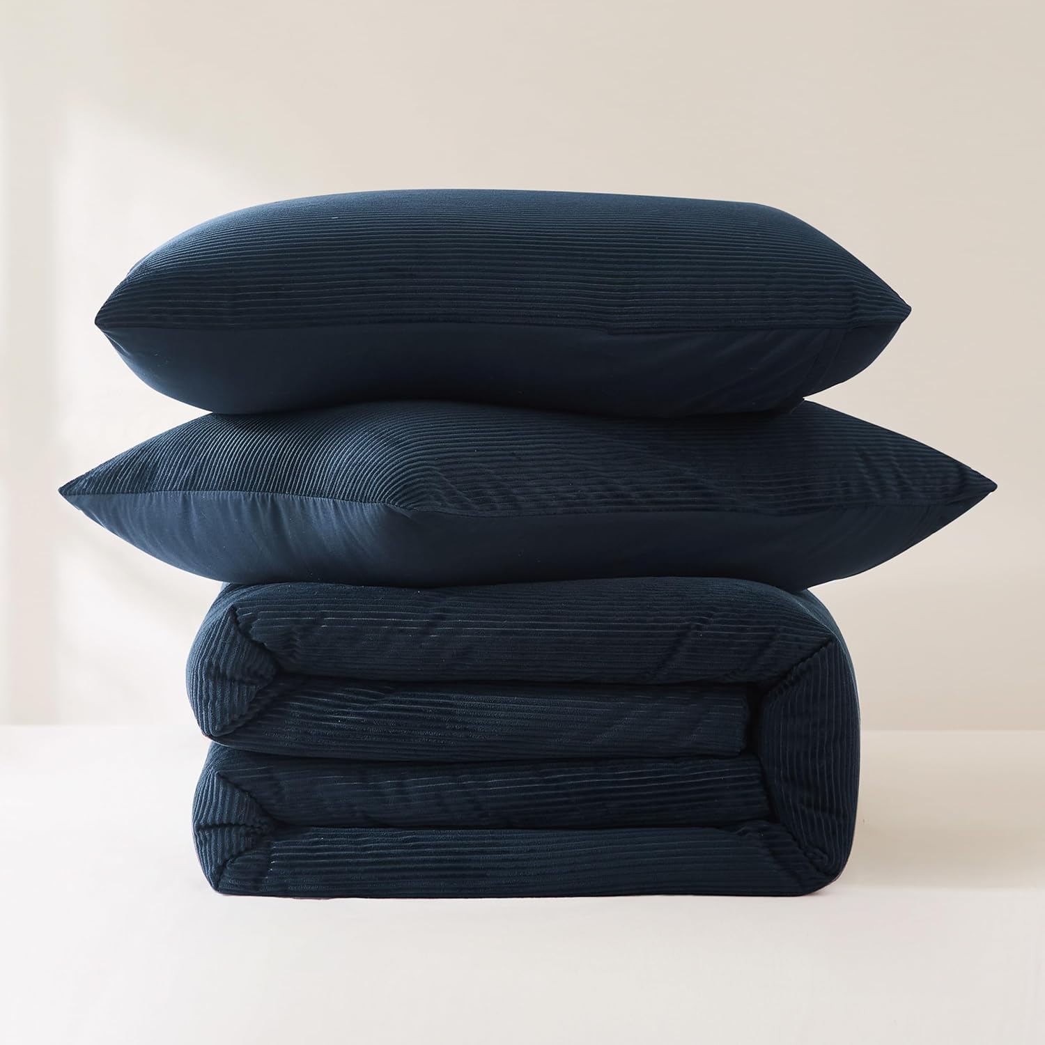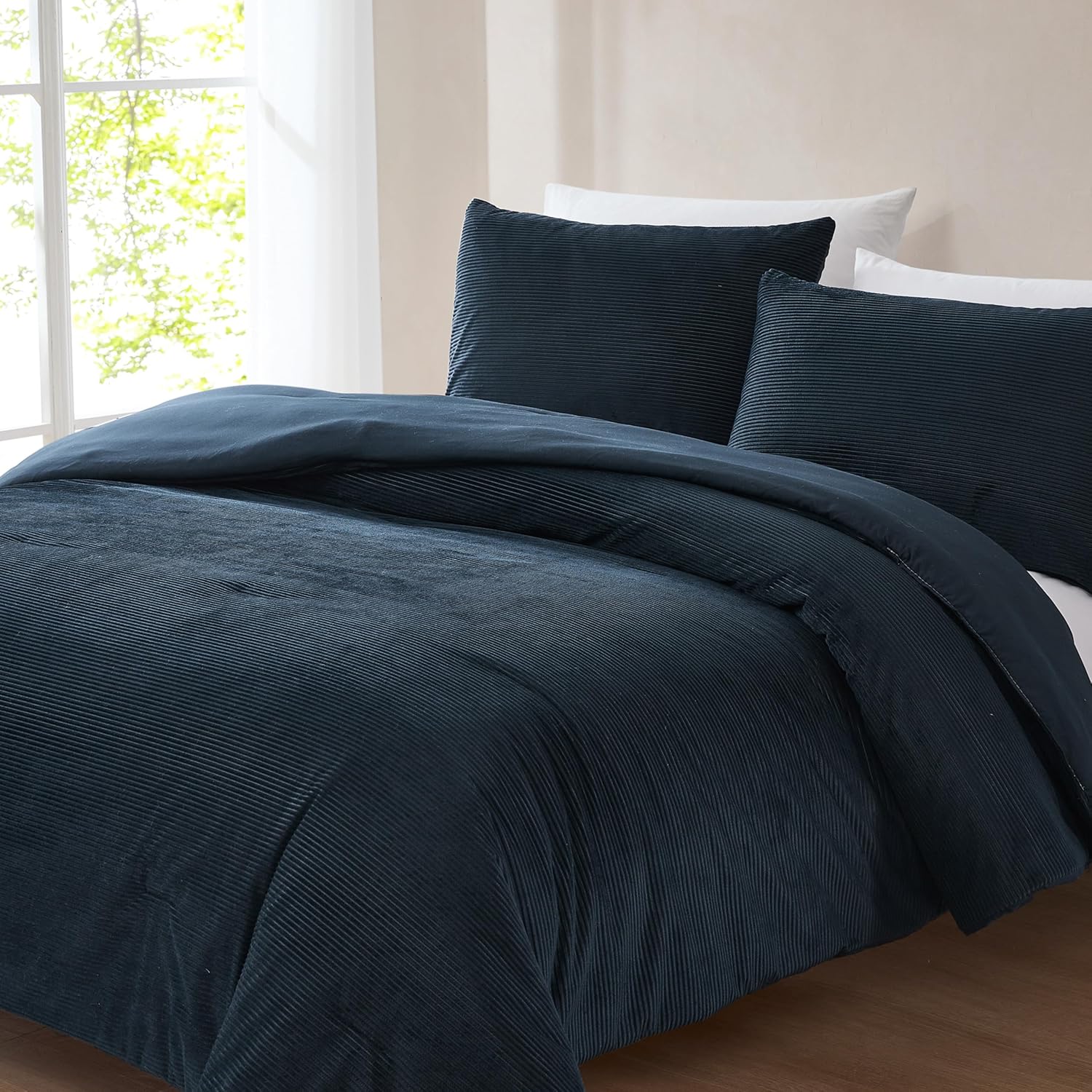 This comforter set is the irresistibly soft bedding you've been dreaming of! With a corduroy texture of ribbed lines, this plush velvet bedding creates the coziest retreat. The dark solid color paired with bold texture creates a minimalist retro vibe. Crafted from a soft poly velvet fabric with a medium weight polyfill for year-round comfort. This 3 piece bedding set includes 1 comforter and 2 shams. STANDARD 100 by OEKO-TEX® certified, all components have been tested and certified free from harmful substances. Machine washable.