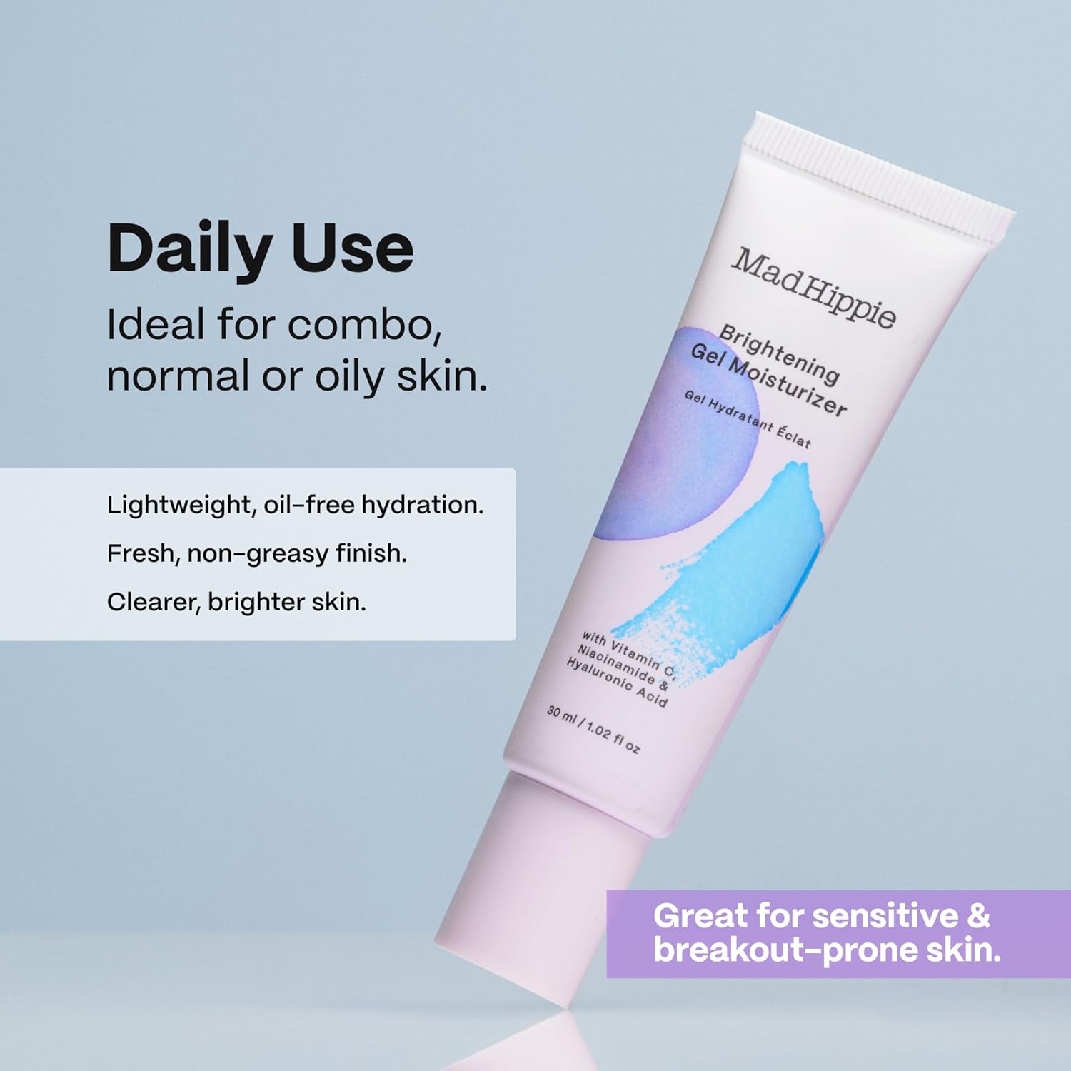 Meet your new daily glow-getter. Mad Hippie Brightening Gel Moisturizer is a lightweight, hydrating formula designed to replenish moisture while helping skin look brighter, smoother, and more refreshed. Its silky gel texture absorbs quickly, making it perfect for layering under makeup or wearing alone for a fresh, dewy finish. Formulated with ethyl ascorbic acid, a stable and effective form of vitamin C, this moisturizer helps support visible brightness and antioxidant protection. Niacinamide works alongside to help calm the look of redness and promote a more even-looking complexion. Hydration heroes like hyaluronic acid and betaine draw moisture into the skin, supporting a soft, plump feel without clogging pores (non-comedogenic). Gentle, effective, and thoughtfully crafted, this gel moisturizer delivers balanced hydration and brightness—no heavy creams required. Perfect for those seeking clean, conscious skincare that performs beautifully, Mad Hippie Brightening Gel Moisturizer fits seamlessly into both morning and evening routines.