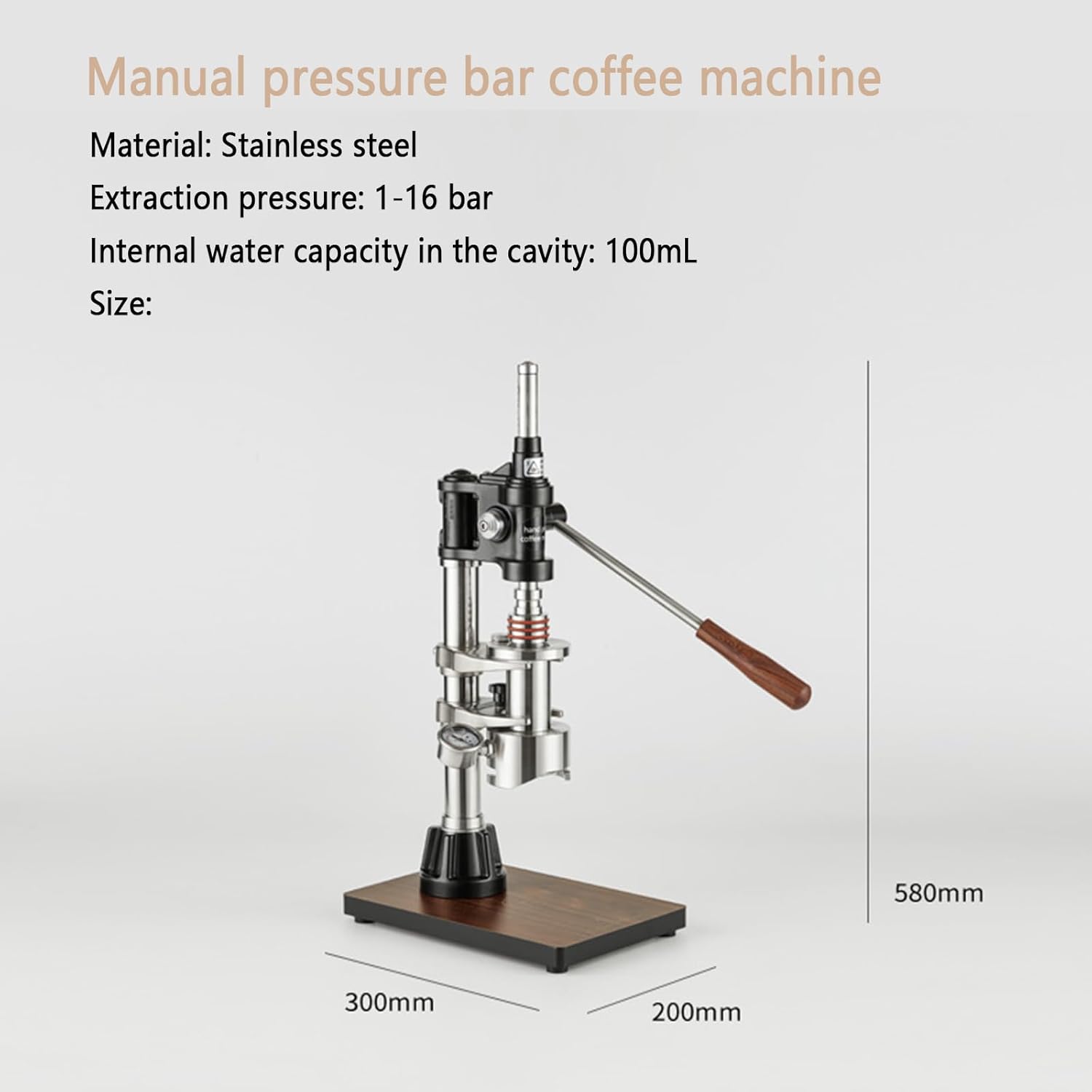 Product name: Hand pressed coffee machine Material: stainless steel/aluminum alloy/walnut/acrylic Yiqi pressure: 1-16BAR Capacity:100ML Weight: about 9KG Handle length: 31.5cm Size:30*20*58cm Package includes: Coffee machine*1