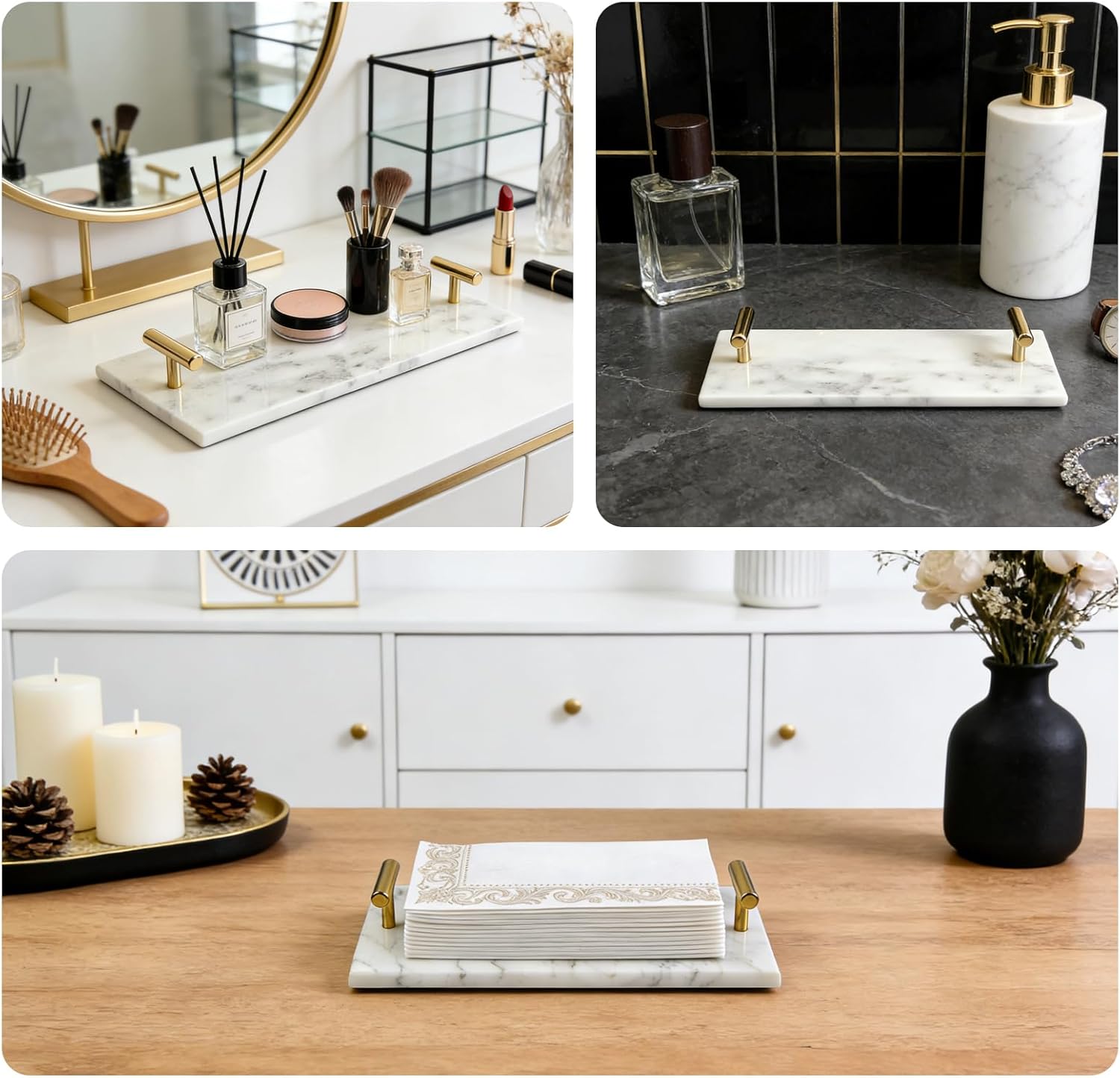 This marble accessory blends elegance and utility: crafted from high-grade white marble, it serves as a napkin holder, guest towel organizer, and decorative tray, fitting bathroom and kitchen countertops. Durable against wear, it resists scratches and stains. With ergonomic handles and a non-slip base, it’s portable and ready to use without installation. Its timeless design complements diverse decor, keeping spaces organized while adding a touch of luxury.