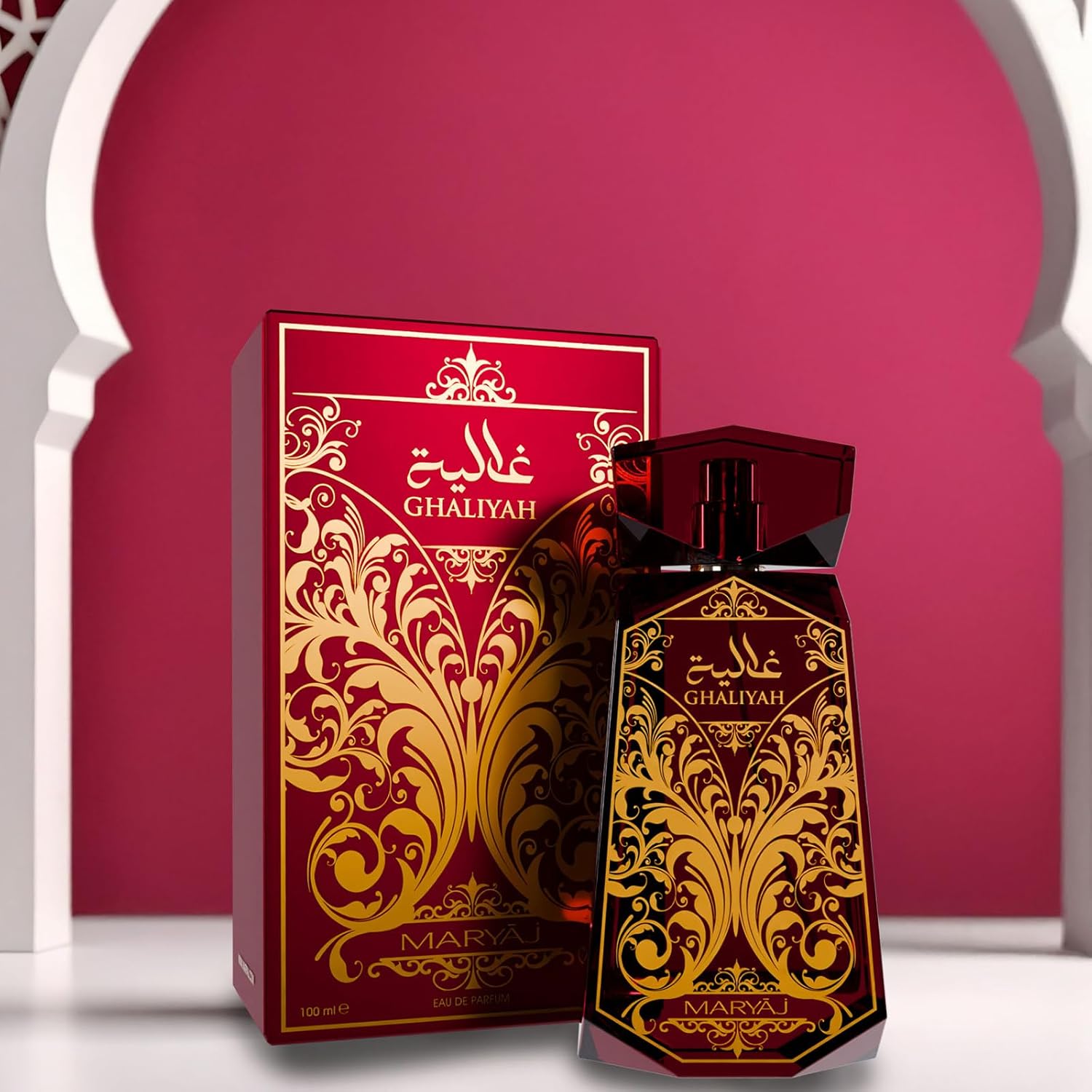 Maryaj Ghaliyah Eau de Parfum is a refined scent crafted for those who appreciate balance in fragrances. Opening with fruity freshness and spicy tones, it creates an energizing and vibrant introduction that appeals to fans of both mens fragrances and women's fragrances. The heart reveals a floral perfume character. At the base, a warm combination of amber perfume, woody richness, musk sensuality, and moss delivers depth that lingers, making it a true long-lasting men's and women's perfume. It fits seamlessly into any collection. With its balance of freshness, florals, and warmth, it stands out as a versatile eau de parfum for women and men that remains memorable long after it's worn.