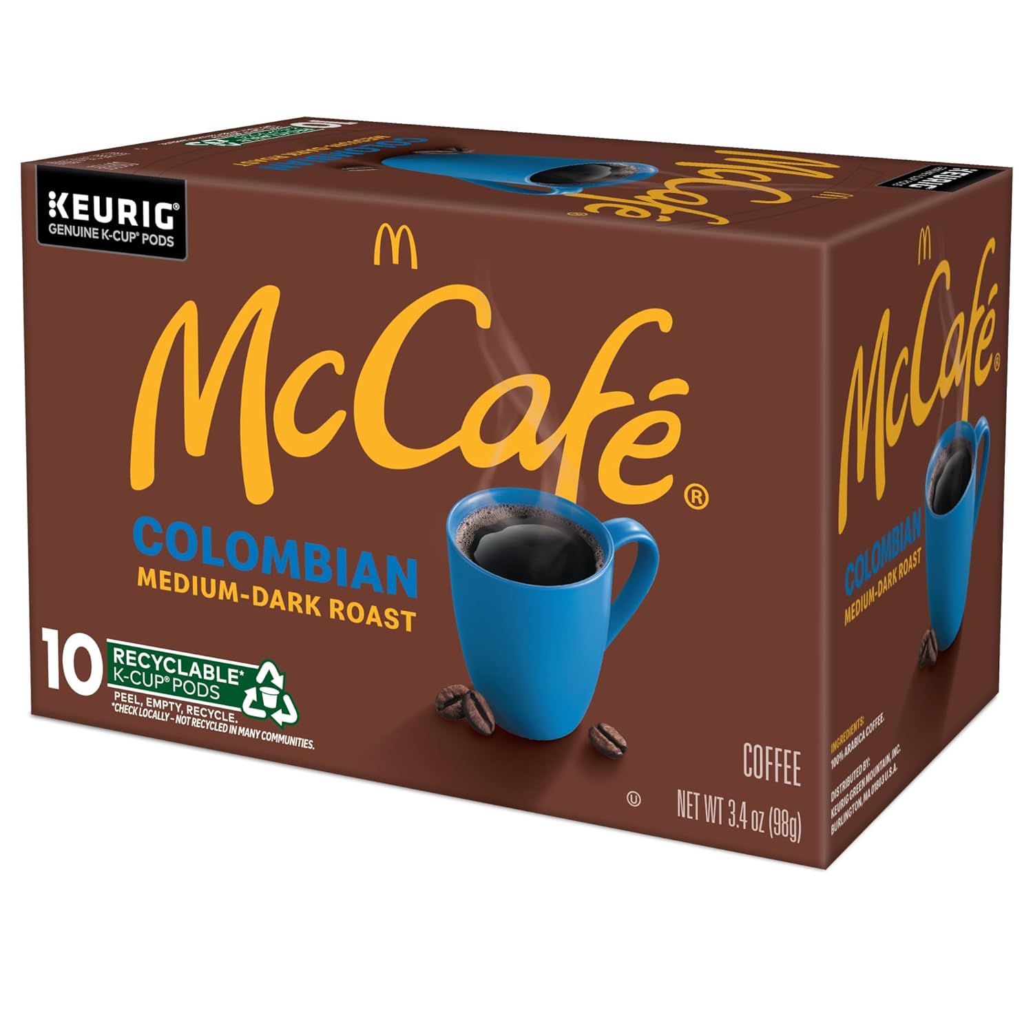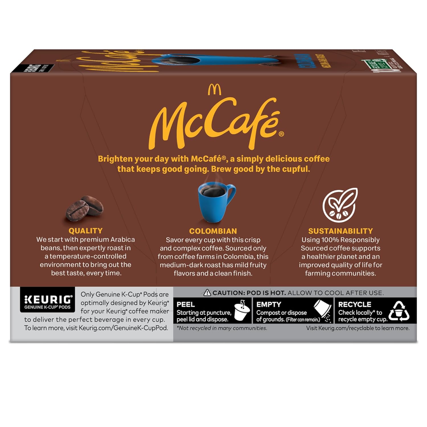 Start your day in a surprisingly good way with a crisp and deliciously complex cup of McCafé Colombian. This medium-dark roast coffee has mild fruity flavors and a clean finish. Sourced only from coffee farms in Colombia, these 100% premium Arabica coffee beans are carefully harvested from the rich soils and mountainous region before coming to us. Then we expertly roast them in a temperature-controlled environment to bring out the best taste in every cup, every time. To keep the good going, we use only responsibly sourced coffee. That means we support a healthier planet and an improved quality of life for farming communities. Not only are McCafé K-Cup pods made from recyclable materials, they are recyclable.* Enjoy the freshly brewed flavor you’ve come to expect. And when you’re done, just Peel. Empty. Recycle. Each K-Cup pod in this package contains medium-dark roast, caffeinated ground coffee from 100% Arabica beans. They have been certified Orthodox Union Kosher. With this purchase, you can be assured you are receiving genuine single serve coffee K-Cup pods; they have been engineered for quality and are compatible with all Keurig K-Cup coffee makers. Simple. Delicious. Brew good by the cupful.*Check locally, not recycled in many communities.