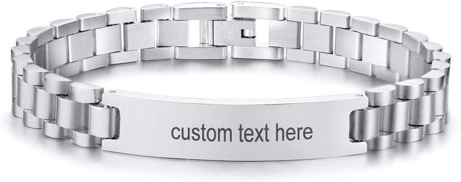 Personalized Customized Free Engraving Stainless Steel Chain Watch Band Wristband Link ID Bracelets for Men,8.2" PERSONALIZATION: a: Select correct style name or colorb: Click the yellow button on right "Customize Now"c: Write the text you like to be engraved, it could be Name,Initials, Coordinate, Date or even a phase of words, Message,Monogram,symbol etc d: Click "Add to Cart" your engrave information will be saved if you add to cartIf the Self-Customize Service can not satisfy your request,please "Contact Seller"after your order. Personalized Jewelry:Unique Meaningful memorial gift for your friend,family,lover etc, or a good treat for yourselfA beautiful velvet bag ready for gift givingHandcrafted with care, Custom engrave your jewelry gift to the special one Perfect gift for birthday, anniversary,engagement,christmas,surprise gift, graduation, valentine's day, inspirational gift etc. About stainless steel Jewelry: Stainless steel jewelry has become increasingly popular in recent years due to changing tastes and style trends that lean toward a more industrial look. Commonly used in a variety of industrial applications, Stainless Steel has found its way to fashion where it's used in everything from necklaces to earrings. It's a jewelry that you can wear a very long time. Stainless steel jewelry is very easy to care for with its tough material that is able to endure a lot of wear and tear. This metal type is able to withstand moisture without tarnish or corrosion.