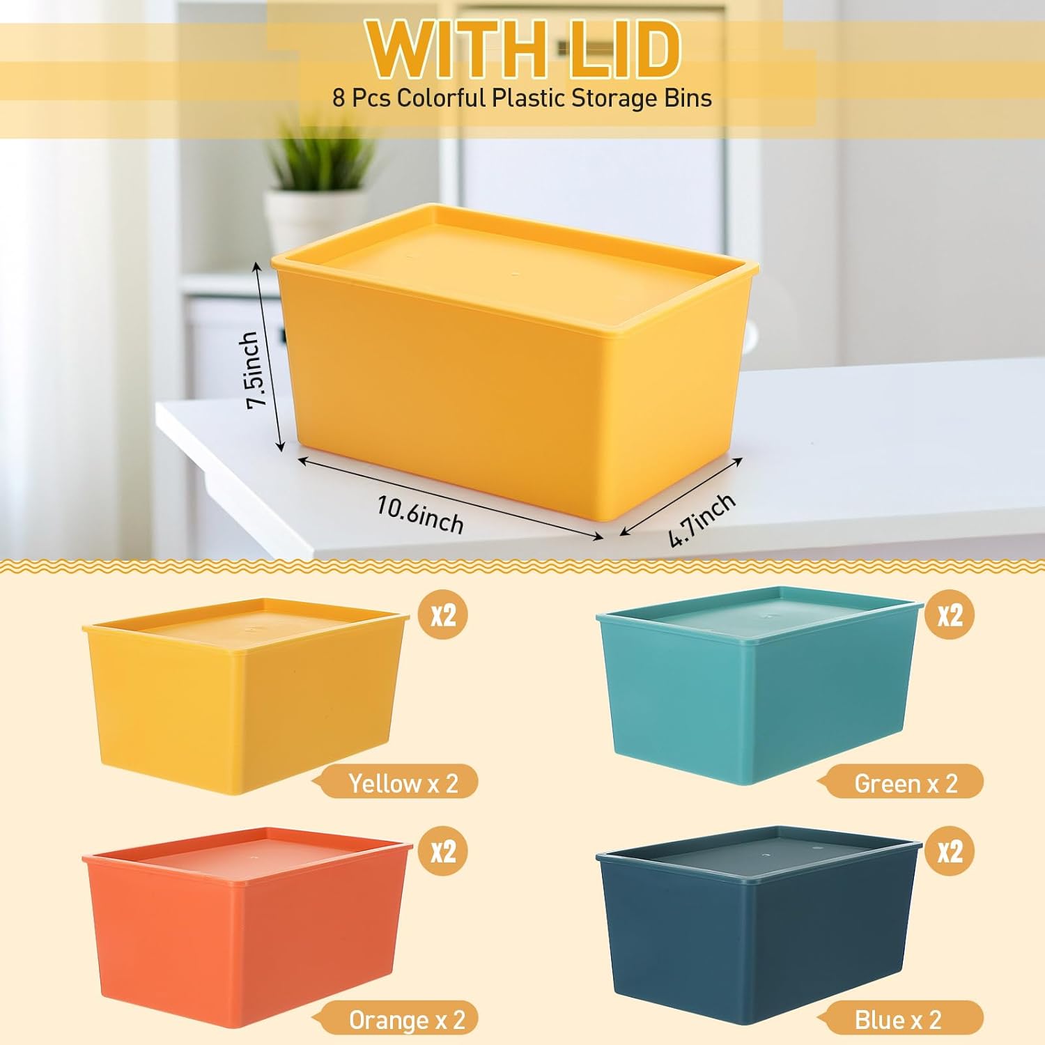 Features: Practical and warm gift choice: With classic color match, the stackable storage bins can be applied as thoughtful presents for your friends, relatives or family members, they will be happy and surprised to receive these gifts. Organize and save your place: These versatile plastic storage containers not only boost your space's aesthetics but also cater to numerous storage needs. These plastic containers for organizing are stackable when not in use, will not take up much space in your house, apartment, and classroom, making them easy to move. Specifications: Material: plastic Color: as shown Size: about 10.6"L x 7.5"W x 4.7"H Package includes: Quantity Set 1: 4 x Storage containers with lids Quantity Set 2: 8 x Storage containers with lids Notes: Manual measurement, please allow slight errors on size. The color may exist a slight difference due to different screen displays.