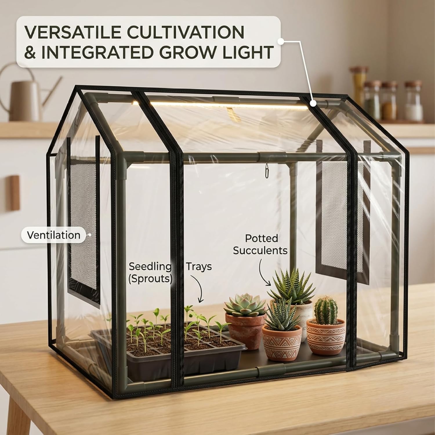 Description: Give your plants a cozy, protected space with our compact indoor greenhouse. Perfect for gardening enthusiasts with limited space, this clear greenhouse creates an ideal microclimate for nurturing succulents, starting seeds, or protecting delicate seedlings. Crafted with a sturdy black frame and a transparent PVC cover, this unit is both sturdy and visually discreet. The reinforced connectors ensure stability, so you can trust it to hold your precious plants securely. Setting up is straightforward and requires no special tools. One of the standout features is the integrated hanging hook on top. This smart addition lets you position a supplemental grow light directly over your plants, solving the challenge of low natural light in many indoor areas. Inside, the spacious 60cm x 40cm base accommodates multiple small pots or standard seedling trays, keeping your gardening projects organized. The cover helps retain beneficial warmth and humidity to encourage germination and growth, while its design allows for necessary airflow. This helps create a balanced environment that can support your plants through various stages. Whether you're a beginner looking to start your first herb garden or an experienced plant lover propagating rare succulents, this mini greenhouse provides a practical and efficient solution for year-round indoor gardening. Features:. -Color: Transparent. -Material: PVC. -Size: 60 × 40 × 50 cm / 23.6 × 15.7 × 19.7 inch. Note:Manual measurement, please allow slight errors on size.The colors may exist slight difference due to different screens. Package Including 1 * Mini Greenhouse Indoor