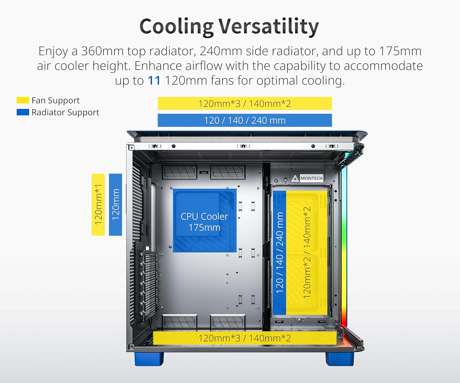 1. Beyond Flat Screens: The Allure of Curved Glass Experiences Elevate Your Viewing Experience with Curved Glass Elegance - After a year of rigorous testing, KING 95's Industrial-Grade Curved Tempered Glass boasts optimal curvature and unmatched durability, ensuring crystal-clear component visibility from every angle. 2. Cooling Options Galore: Liquid, Air, and Fan-Friendly Adaptability Meets Your Choices for Total Comfort - KING 95 offers versatile cooling, supporting a 360mm top radiator, 240mm side radiator (up to 60mm thickness) without any interference, and up to 175mm air cooler height for flexible component customization. 3. Innovation in Every Frame: Our Patented Side Fan Bracket Unique side fan mounting design for improved airflow - KING 95 introduces a patented adjustable side fan bracket that can be rotated to the front for improved airflow. This design offers versatility for both cooling performance and aesthetics, providing unmatched personalization options. 4. Dynamic Duo Airflow Modes Elegant Glass Mode- Achieves efficient case cooling with side and bottom air intake, seamlessly blending function and aesthetics. Turbo Mesh Mode- Utilizing a 3-directional cooling, it efficiently draws in air from the front, side, and bottom while expelling heat through the top and rear, ensuring rapid and effective cooling. 5. Safeguard with Style: The 0.8mm Fortress Discover the ultimate in durability with the KING 95, crafted from 0.8mm-thick metal for a sleek design that ensures sturdy protection. 6. Masterpiece Unleashed: The Zenith of Premium Series A Symphony of Luxury: Discovering the Zenith in KING 95 - Step into the future with Montech's KING Series – the epitome of premium materials and cutting-edge design. KING is the result of our relentless pursuit of quality and innovation, seamlessly blending top-tier materials with distinctive aesthetics. Whether you're a trend-setting gamer or a visionary creator striving for excellence, KING Series is designed to meet and exceed your every tech component desire. This collection embodies our unyielding commitment to excellence. KING 95, our flagship product, stands as a symbol of our unwavering dedication to quality. With its captivating exterior design and groundbreaking features, KING Series promises to immerse you in a world of tech-driven excitement. 7. Beyond Flat Screens: The Allure of Curved Glass Experiences Elevate Your Viewing Experience with Curved Glass Elegance - After a year of rigorous testing, KING 95's Industrial-Grade Curved Tempered Glass boasts optimal curvature and unmatched durability, ensuring crystal-clear component visibility from every angle. 8. Unleash the Power of Resilience: Unwavering Tempered Glass Breaking Barriers, Not Glass: The Odyssey of Unwavering Tempered Resilience - The KING 95 case's glass is meticulously crafted from industrial-grade 4mm tempered glass, known for its exceptional strength, durability, scratch resistance, and impact resilience. 9. Aesthetic ARGB Lighting Transform your space with mesmerizing Addressable RGB lighting - KING 95 features a seamlessly integrated front panel light strip with a curved design, offering a variety of built-in lighting modes, allowing the creation of stunning artistic effects. 10. Hardware Harmony with Dual Chamber: Exceptional Compatibility Designed to accommodate the mightiest 40 series graphics cards - KING 95's dual-chamber is designed to accommodate 8 hard drives, dual power supplies, and flagship 4090 graphics cards. It offers over 35mm of cable management space, optimizing cooling and providing robust hardware support. 11. Building Bliss: A Symphony of PC Building Unprecedented Enjoyment in Building - KING 95 offers quick-release glass panels and a spacious interior for clean cable management, featuring a hassle-free assembly. 12. Fortress of Cleanliness: Defend Your PC with Built-in Filters Sentinels of Clarity: Defend Your PC with Embedded Filters - KING 95 features easily removable top, side, and bottom panels, each equipped with dedicated dust filters. This meticulous design ensures that your build maintains its polished and uncluttered appearance. 13. Every Shade Tells a Story: Your Choice of Four Every Hue, Every Story: Discover Your Fourfold Palette - KING 95 dazzles with four captivating color options, allowing you to transform your build into a true masterpiece. Choose from Gentleman Black, Pure White, Vibrant Red, or Prussian Blue.