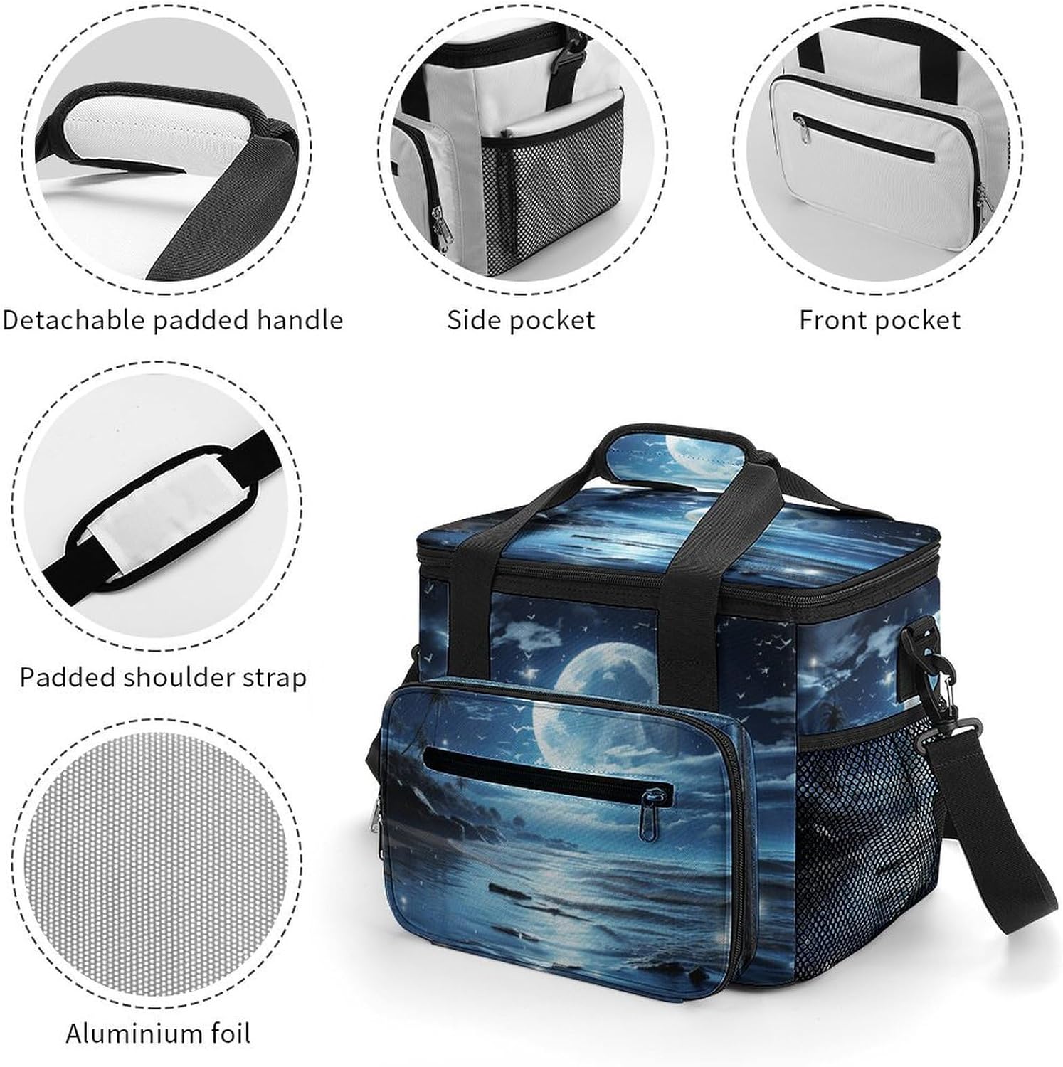 When you're looking for a reliable way to keep your food and drinks fresh while on the move, our Moon Over Ocean insulated cooler tote is the perfect solution. Made from high-density Oxford cloth with an upgraded aluminum foil lining, it offers superior insulation that maintains the temperature of your items for hours. The leakproof design ensures no messy spills, and the sturdy construction means it can handle the rigors of daily use, whether you're commuting to work or heading out for a weekend camping trip.The 22.5L large capacity provides ample space for all your essentials, from sandwiches and salads to cans of soda and bottles of water. The comfortable 66cm straps make it easy to carry, and the compact vertical design doesn't take up unnecessary space in your car or backpack. Whether you're packing a meal for the office, preparing for a family picnic, or stocking up on groceries, this cooler bag has you covered.Forget about flimsy coolers that fall apart after a few uses or fail to keep your food fresh. Our reusable cooler tote combines practicality, durability and style in one package. Its neutral design works for everyone, and its versatility makes it a must-have accessory for anyone with an active lifestyle. Invest in a cooler bag that meets all your needs and simplifies your on-the-go eating experience. Lightweight Cooler Bags Oxford Cloth Cooler Bags Ice Packs Reinforced Handle Ice Chest Cooler Bag Tote Cooler Bag Versatile Cooler Bags Portable Insulated Cooling Everyday Cooler